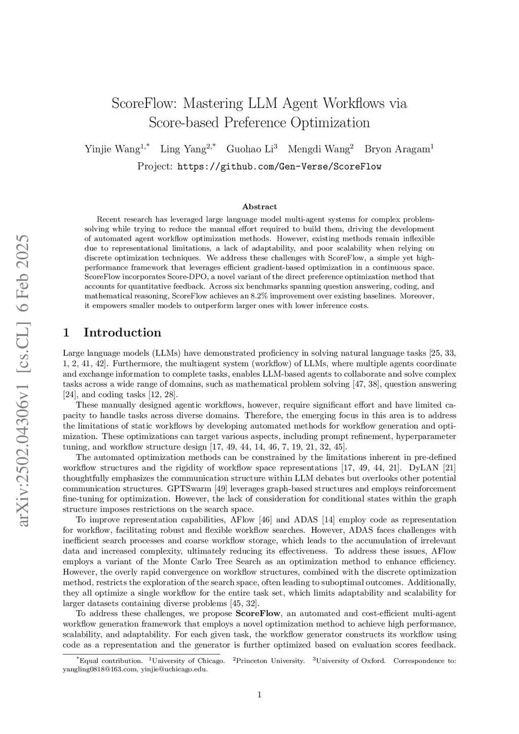 Recent research has leveraged large language model multi-agent systems for complex problem-solving while trying to reduce the manual effort required to build them, driving the development of automated agent workflow optimization methods. However, existing methods remain inflexible due to representational limitations, a lack of adaptability, and poor scalability when relying on discrete optimization techniques. We address these challenges with ScoreFlow, a simple yet high-performance framework that leverages efficient gradient-based optimization in a continuous space. ScoreFlow incorporates Score-DPO, a novel variant of the direct preference optimization method that accounts for quantitative feedback. Across six benchmarks spanning question answering, coding, and mathematical reasoning, ScoreFlow achieves an 8.2% improvement over existing baselines. Moreover, it empowers smaller models to outperform larger ones with lower inference costs. Project:this https URL
