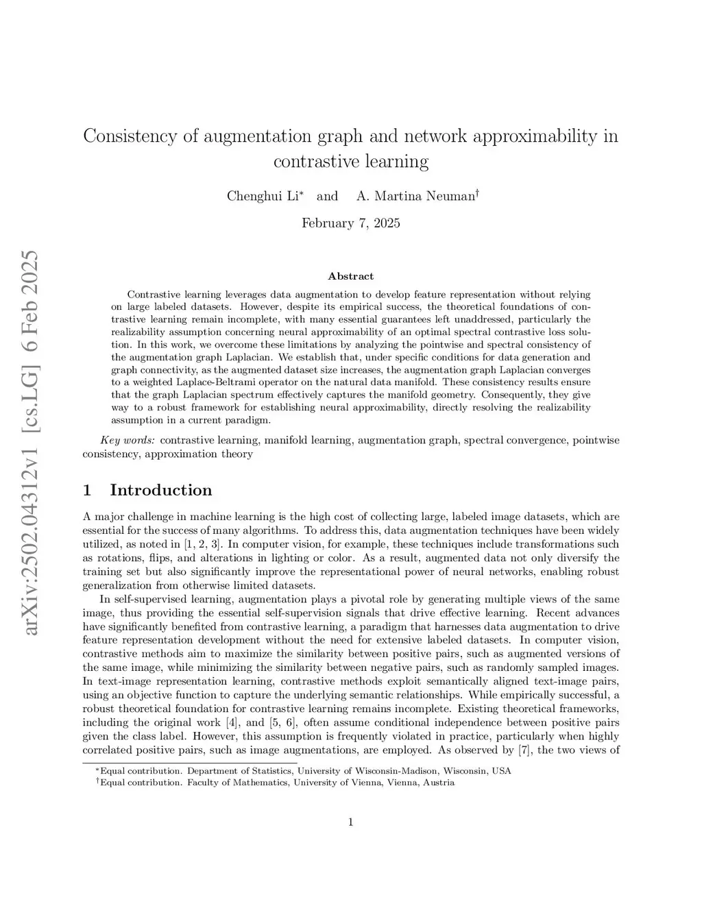 Contrastive learning leverages data augmentation to develop feature representation without relying on large labeled datasets. However, despite its empirical success, the theoretical foundations of contrastive learning remain incomplete, with many essential guarantees left unaddressed, particularly the realizability assumption concerning neural approximability of an optimal spectral contrastive loss solution. In this work, we overcome these limitations by analyzing pointwise and spectral consistency of the augmentation graph Laplacian. We establish that, under specific conditions for data generation and graph connectivity, as the augmented dataset size increases, the augmentation graph Laplacian converges to a weighted Laplace-Beltrami operator on the natural data manifold. These consistency results ensure that the graph Laplacian spectrum effectively captures the manifold geometry. Consequently, they give way to a robust framework for establishing neural approximability, directly resolving the realizability assumption in a current paradigm.