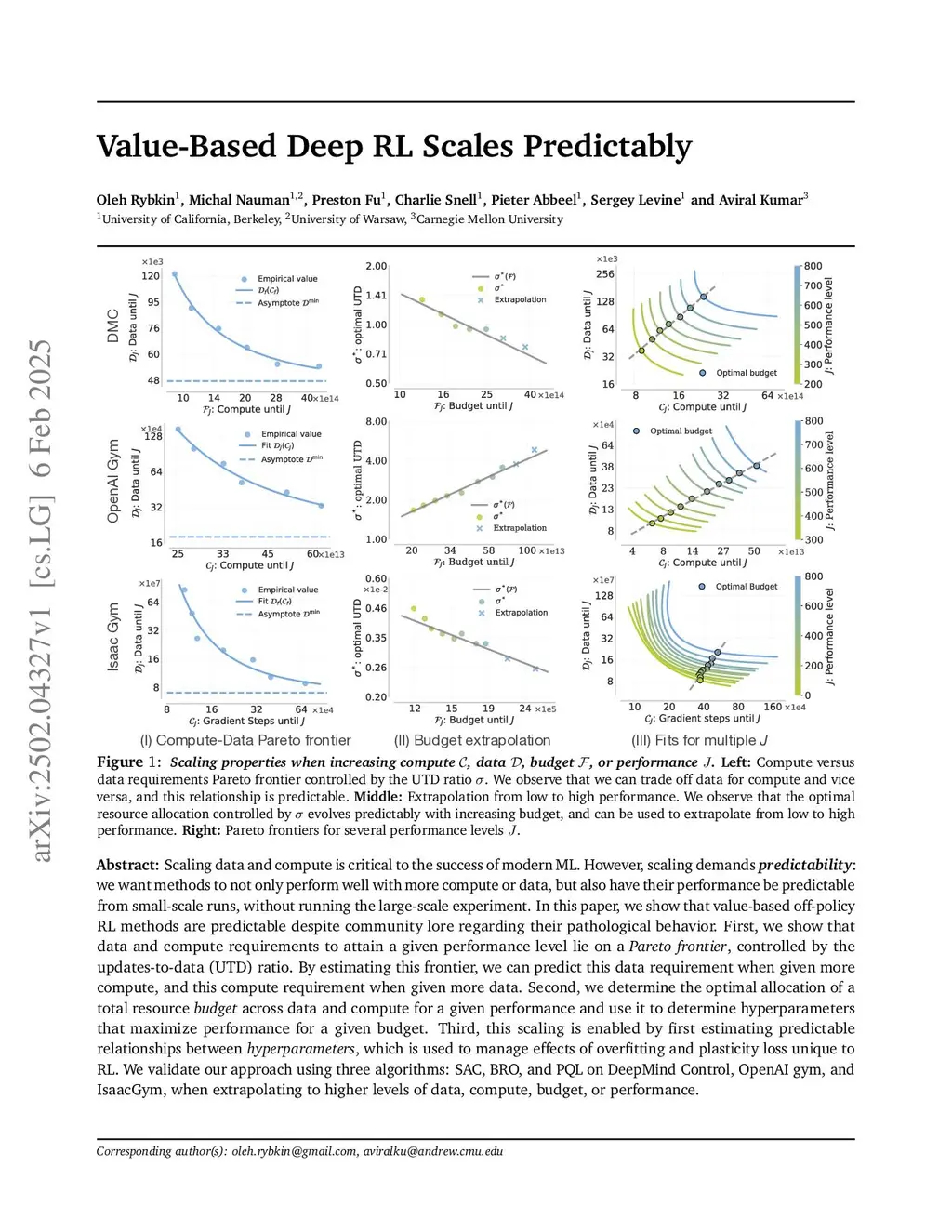 Scaling data and compute is critical to the success of modern ML. However, scaling demands predictability: we want methods to not only perform well with more compute or data, but also have their performance be predictable from small-scale runs, without running the large-scale experiment. In this paper, we show that value-based off-policy RL methods are predictable despite community lore regarding their pathological behavior. First, we show that data and compute requirements to attain a given performance level lie on a Pareto frontier, controlled by the updates-to-data (UTD) ratio. By estimating this frontier, we can predict this data requirement when given more compute, and this compute requirement when given more data. Second, we determine the optimal allocation of a total resource budget across data and compute for a given performance and use it to determine hyperparameters that maximize performance for a given budget. Third, this scaling is enabled by first estimating predictable relationships between hyperparameters, which is used to manage effects of overfitting and plasticity loss unique to RL. We validate our approach using three algorithms: SAC, BRO, and PQL on DeepMind Control, OpenAI gym, and IsaacGym, when extrapolating to higher levels of data, compute, budget, or performance.