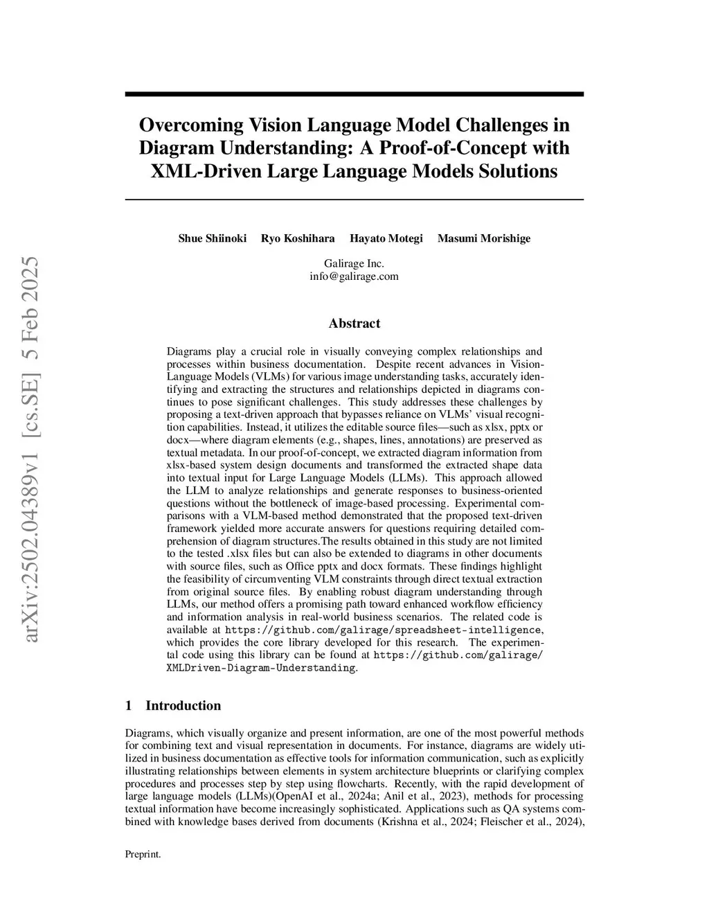 Overcoming Vision Language Model Challenges in Diagram Understanding: A Proof-of-Concept with XML-Driven Large Language Models Solutions