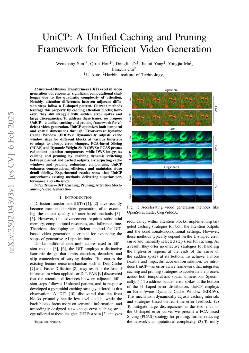 Diffusion Transformers (DiT) excel in video generation but encounter significant computational challenges due to the quadratic complexity of attention. Notably, attention differences between adjacent diffusion steps follow a U-shaped pattern. Current methods leverage this property by caching attention blocks, however, they still struggle with sudden error spikes and large discrepancies. To address these issues, we propose UniCP a unified caching and pruning framework for efficient video generation. UniCP optimizes both temporal and spatial dimensions through. Error Aware Dynamic Cache Window (EDCW): Dynamically adjusts cache window sizes for different blocks at various timesteps, adapting to abrupt error changes. PCA based Slicing (PCAS) and Dynamic Weight Shift (DWS): PCAS prunes redundant attention components, and DWS integrates caching and pruning by enabling dynamic switching between pruned and cached outputs. By adjusting cache windows and pruning redundant components, UniCP enhances computational efficiency and maintains video detail fidelity. Experimental results show that UniCP outperforms existing methods in both performance and efficiency.