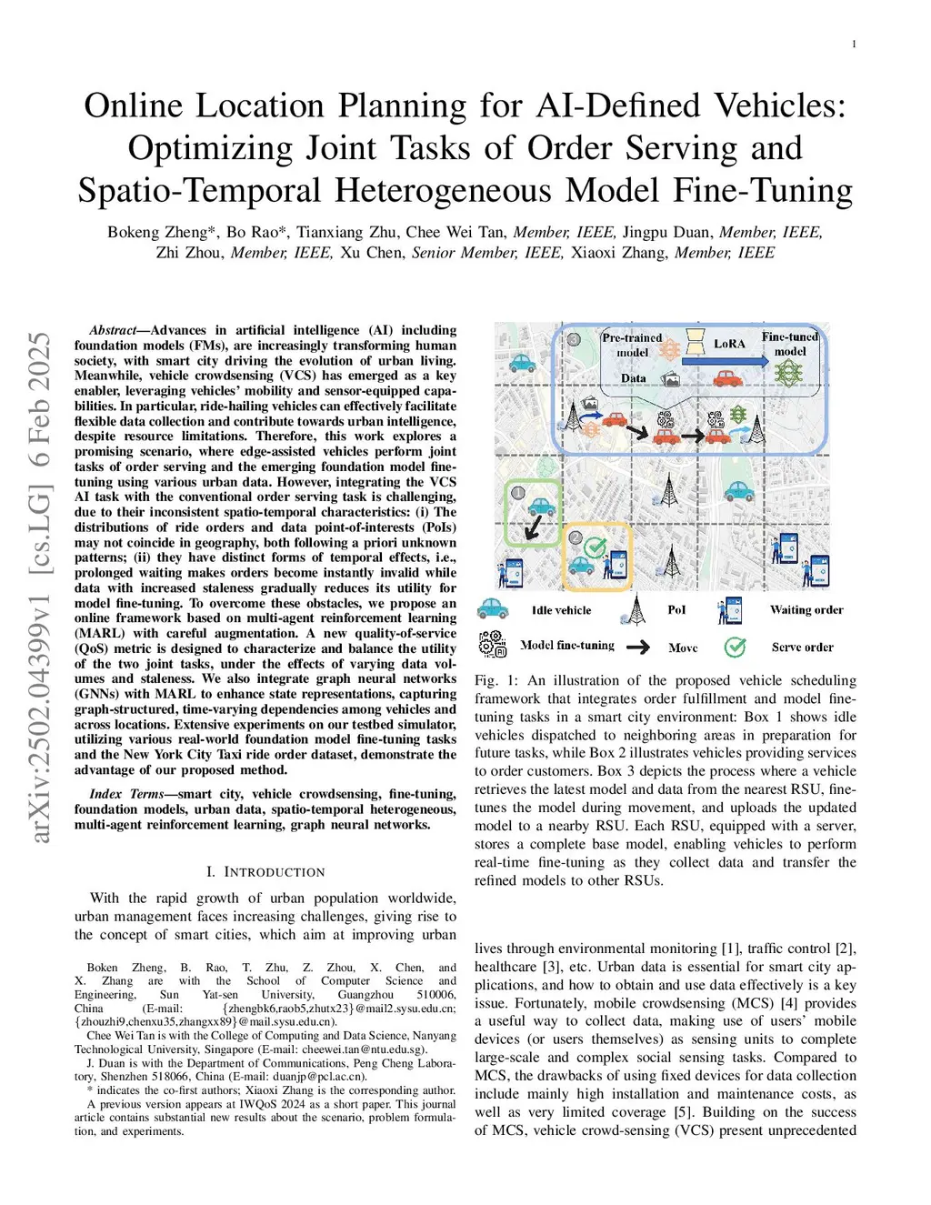 Advances in artificial intelligence (AI) including foundation models (FMs), are increasingly transforming human society, with smart city driving the evolution of urbanthis http URL, vehicle crowdsensing (VCS) has emerged as a key enabler, leveraging vehicles' mobility and sensor-equipped capabilities. In particular, ride-hailing vehicles can effectively facilitate flexible data collection and contribute towards urban intelligence, despite resource limitations. Therefore, this work explores a promising scenario, where edge-assisted vehicles perform joint tasks of order serving and the emerging foundation model fine-tuning using various urban data. However, integrating the VCS AI task with the conventional order serving task is challenging, due to their inconsistent spatio-temporal characteristics: (i) The distributions of ride orders and data point-of-interests (PoIs) may not coincide in geography, both following a priori unknown patterns; (ii) they have distinct forms of temporal effects, i.e., prolonged waiting makes orders become instantly invalid while data with increased staleness gradually reduces its utility for modelthis http URLovercome these obstacles, we propose an online framework based on multi-agent reinforcement learning (MARL) with careful augmentation. A new quality-of-service (QoS) metric is designed to characterize and balance the utility of the two joint tasks, under the effects of varying data volumes and staleness. We also integrate graph neural networks (GNNs) with MARL to enhance state representations, capturing graph-structured, time-varying dependencies among vehicles and across locations. Extensive experiments on our testbed simulator, utilizing various real-world foundation model fine-tuning tasks and the New York City Taxi ride order dataset, demonstrate the advantage of our proposed method.
