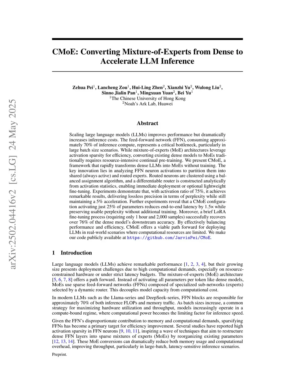 Scaling large language models (LLMs) improves performance but dramatically increases inference costs. The feed-forward network (FFN), consuming approximately 70\% of inference compute, represents a critical bottleneck, particularly in large batch size scenarios. While mixture-of-experts (MoE) architectures leverage activation sparsity for efficiency, converting existing dense models to MoEs traditionally requires resource-intensive continual pre-training. We present CMoE, a framework that rapidly transforms dense LLMs into MoEs without training. The key innovation lies in analyzing FFN neuron activations to partition them into shared (always active) and routed experts. Routed neurons are clustered using a balanced assignment algorithm, and a differentiable router is constructed analytically from activation statistics, enabling immediate deployment or optional lightweight fine-tuning. Experiments demonstrate that, with activation ratio of 75\%, it achieves remarkable results, delivering lossless precision in terms of perplexity while still maintaining a 5\% acceleration. Further experiments reveal that a CMoE configuration activating just 25\% of parameters reduces end-to-end latency by 1.5x while preserving usable perplexity without additional training. Moreover, a brief LoRA fine-tuning process (requiring only 1 hour and 2,000 samples) successfully recovers over 76\% of the dense model's downstream accuracy. By effectively balancing performance and efficiency, CMoE offers a viable path forward for deploying LLMs in real-world scenarios where computational resources are limited. We make our code publicly available atthis https URL.