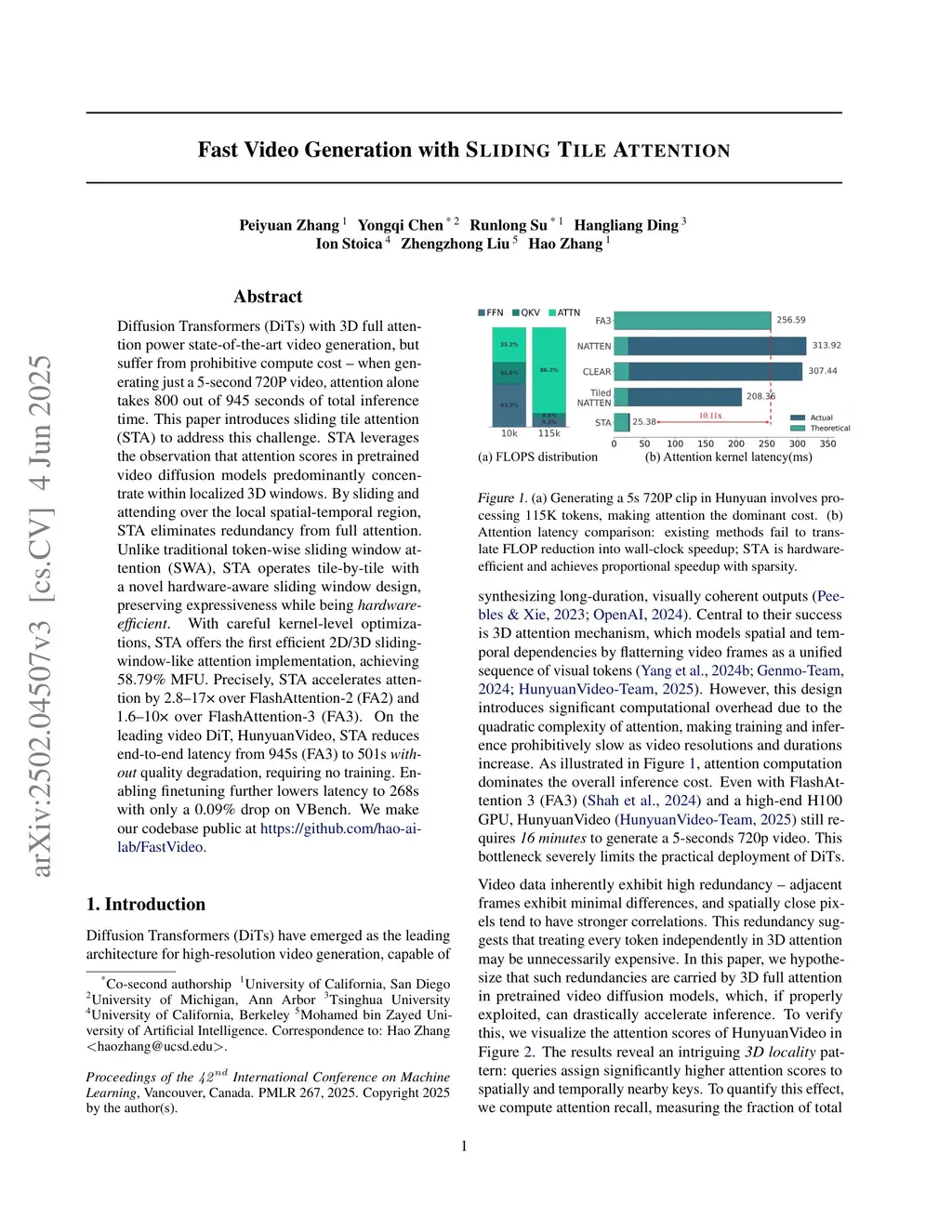 Diffusion Transformers (DiTs) with 3D full attention power state-of-the-art video generation, but suffer from prohibitive compute cost -- when generating just a 5-second 720P video, attention alone takes 800 out of 945 seconds of total inference time. This paper introduces sliding tile attention (STA) to address this challenge. STA leverages the observation that attention scores in pretrained video diffusion models predominantly concentrate within localized 3D windows. By sliding and attending over the local spatial-temporal region, STA eliminates redundancy from full attention. Unlike traditional token-wise sliding window attention (SWA), STA operates tile-by-tile with a novel hardware-aware sliding window design, preserving expressiveness while being hardware-efficient. With careful kernel-level optimizations, STA offers the first efficient 2D/3D sliding-window-like attention implementation, achieving 58.79% MFU. Precisely, STA accelerates attention by 2.8-17x over FlashAttention-2 (FA2) and 1.6-10x over FlashAttention-3 (FA3). On the leading video DiT, HunyuanVideo, STA reduces end-to-end latency from 945s (FA3) to 685s without quality degradation, requiring no training. Enabling finetuning further lowers latency to 268s with only a 0.09% drop on VBench. We make our codebase public atthis https URL.