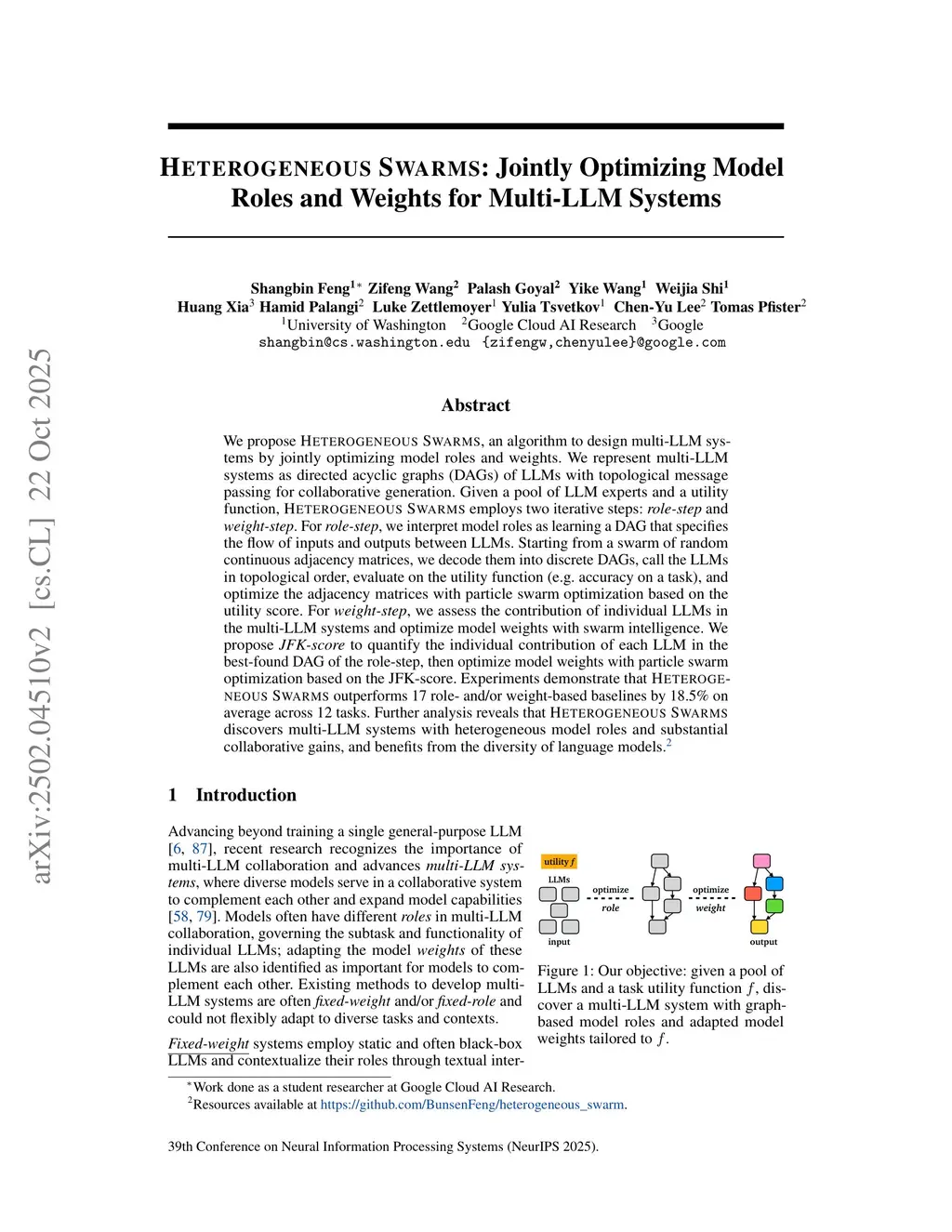 We propose Heterogeneous Swarms, an algorithm to design multi-LLM systems by jointly optimizing model roles and weights. We represent multi-LLM systems as directed acyclic graphs (DAGs) of LLMs with topological message passing for collaborative generation. Given a pool of LLM experts and a utility function, Heterogeneous Swarms employs two iterative steps: role-step and weight-step. For role-step, we interpret model roles as learning a DAG that specifies the flow of inputs and outputs between LLMs. Starting from a swarm of random continuous adjacency matrices, we decode them into discrete DAGs, call the LLMs in topological order, evaluate on the utility function (e.g. accuracy on a task), and optimize the adjacency matrices with particle swarm optimization based on the utility score. For weight-step, we assess the contribution of individual LLMs in the multi-LLM systems and optimize model weights with swarm intelligence. We propose JFK-score to quantify the individual contribution of each LLM in the best-found DAG of the role-step, then optimize model weights with particle swarm optimization based on the JFK-score. Experiments demonstrate that Heterogeneous Swarms outperforms 15 role- and/or weight-based baselines by 18.5% on average across 12 tasks. Further analysis reveals that Heterogeneous Swarms discovers multi-LLM systems with heterogeneous model roles and substantial collaborative gains, and benefits from the diversity of language models.