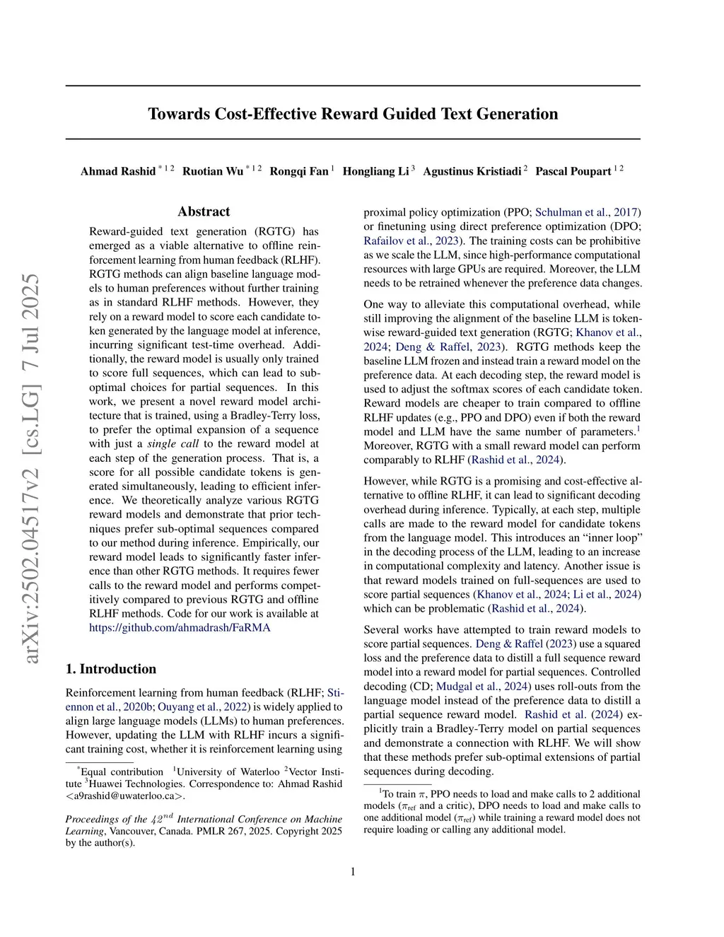Reward-guided text generation (RGTG) has emerged as a viable alternative to offline reinforcement learning from human feedback (RLHF). RGTG methods can align baseline language models to human preferences without further training like in standard RLHF methods. However, they rely on a reward model to score each candidate token generated by the language model at inference, incurring significant test-time overhead. Additionally, the reward model is usually only trained to score full sequences, which can lead to sub-optimal choices for partial sequences. In this work, we present a novel reward model architecture that is trained, using a Bradley-Terry loss, to prefer the optimal expansion of a sequence with just a \emph{single call} to the reward model at each step of the generation process. That is, a score for all possible candidate tokens is generated simultaneously, leading to efficient inference. We theoretically analyze various RGTG reward models and demonstrate that prior techniques prefer sub-optimal sequences compared to our method during inference. Empirically, our reward model leads to significantly faster inference than other RGTG methods. It requires fewer calls to the reward model and performs competitively compared to previous RGTG and offline RLHF methods.