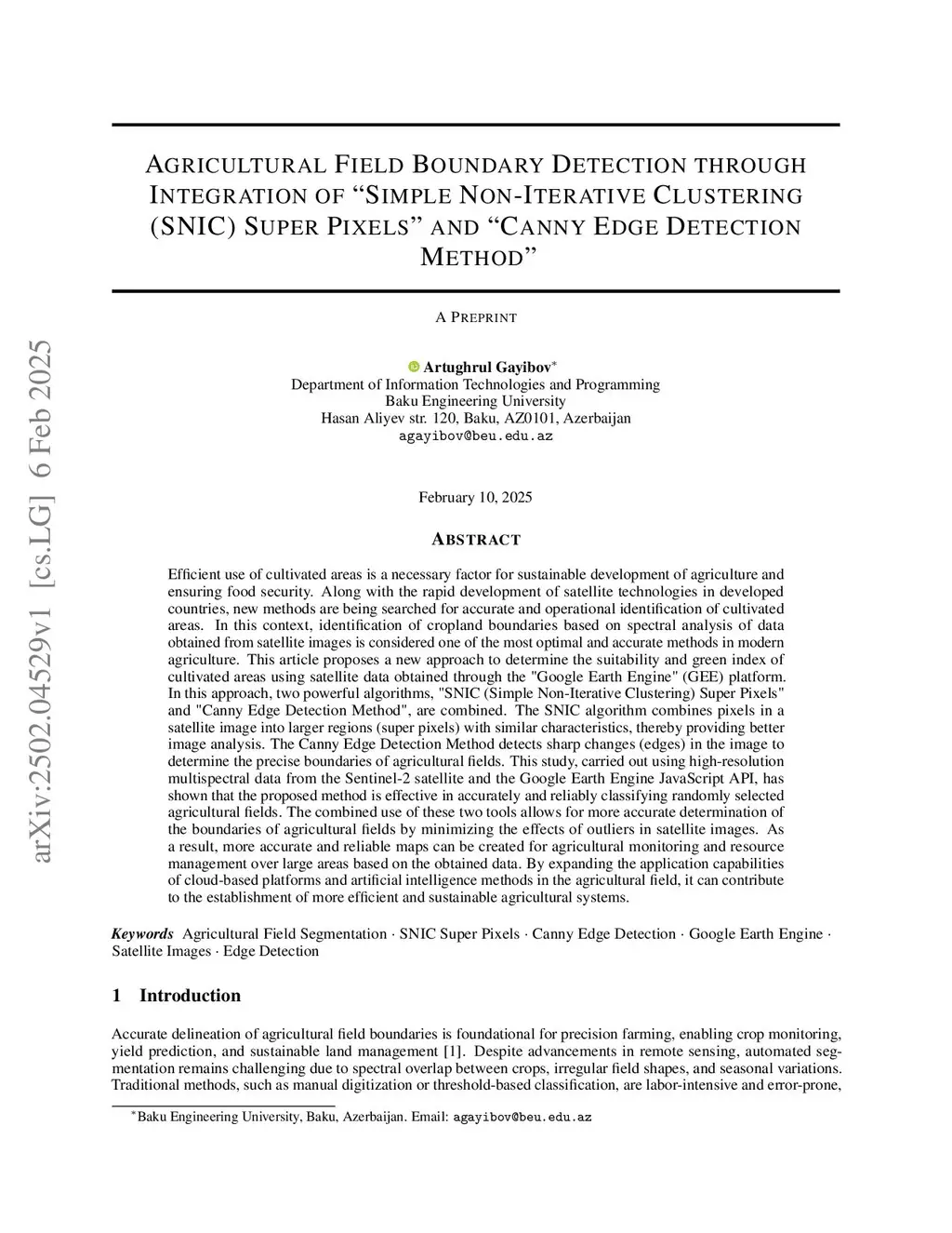 Agricultural Field Boundary Detection through Integration of "Simple Non-Iterative Clustering (SNIC) Super Pixels" and "Canny Edge Detection Method"