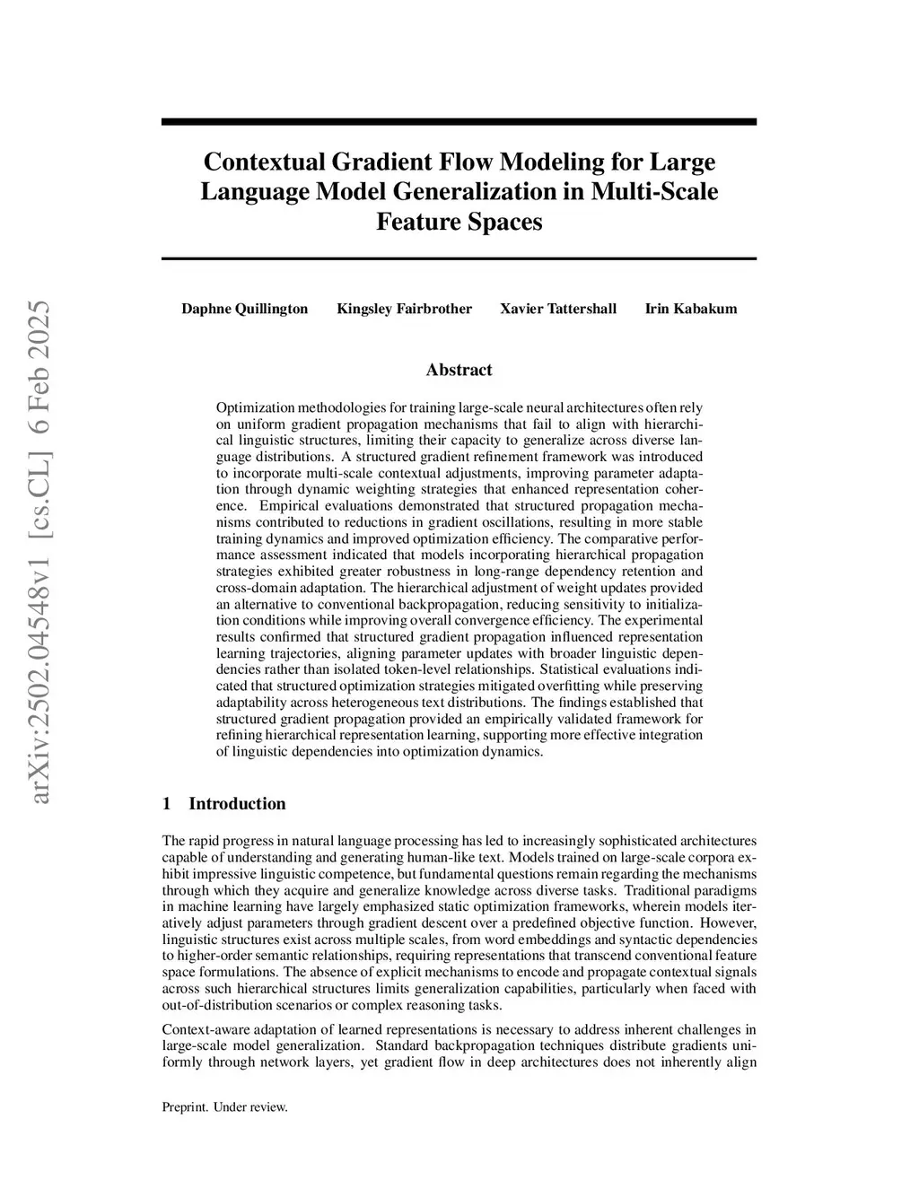 Optimization methodologies for training large-scale neural architectures often rely on uniform gradient propagation mechanisms that fail to align with hierarchical linguistic structures, limiting their capacity to generalize across diverse language distributions. A structured gradient refinement framework was introduced to incorporate multi-scale contextual adjustments, improving parameter adaptation through dynamic weighting strategies that enhanced representation coherence. Empirical evaluations demonstrated that structured propagation mechanisms contributed to reductions in gradient oscillations, resulting in more stable training dynamics and improved optimization efficiency. The comparative performance assessment indicated that models incorporating hierarchical propagation strategies exhibited greater robustness in long-range dependency retention and cross-domain adaptation. The hierarchical adjustment of weight updates provided an alternative to conventional backpropagation, reducing sensitivity to initialization conditions while improving overall convergence efficiency. The experimental results confirmed that structured gradient propagation influenced representation learning trajectories, aligning parameter updates with broader linguistic dependencies rather than isolated token-level relationships. Statistical evaluations indicated that structured optimization strategies mitigated overfitting while preserving adaptability across heterogeneous text distributions. The findings established that structured gradient propagation provided an empirically validated framework for refining hierarchical representation learning, supporting more effective integration of linguistic dependencies into optimization dynamics.