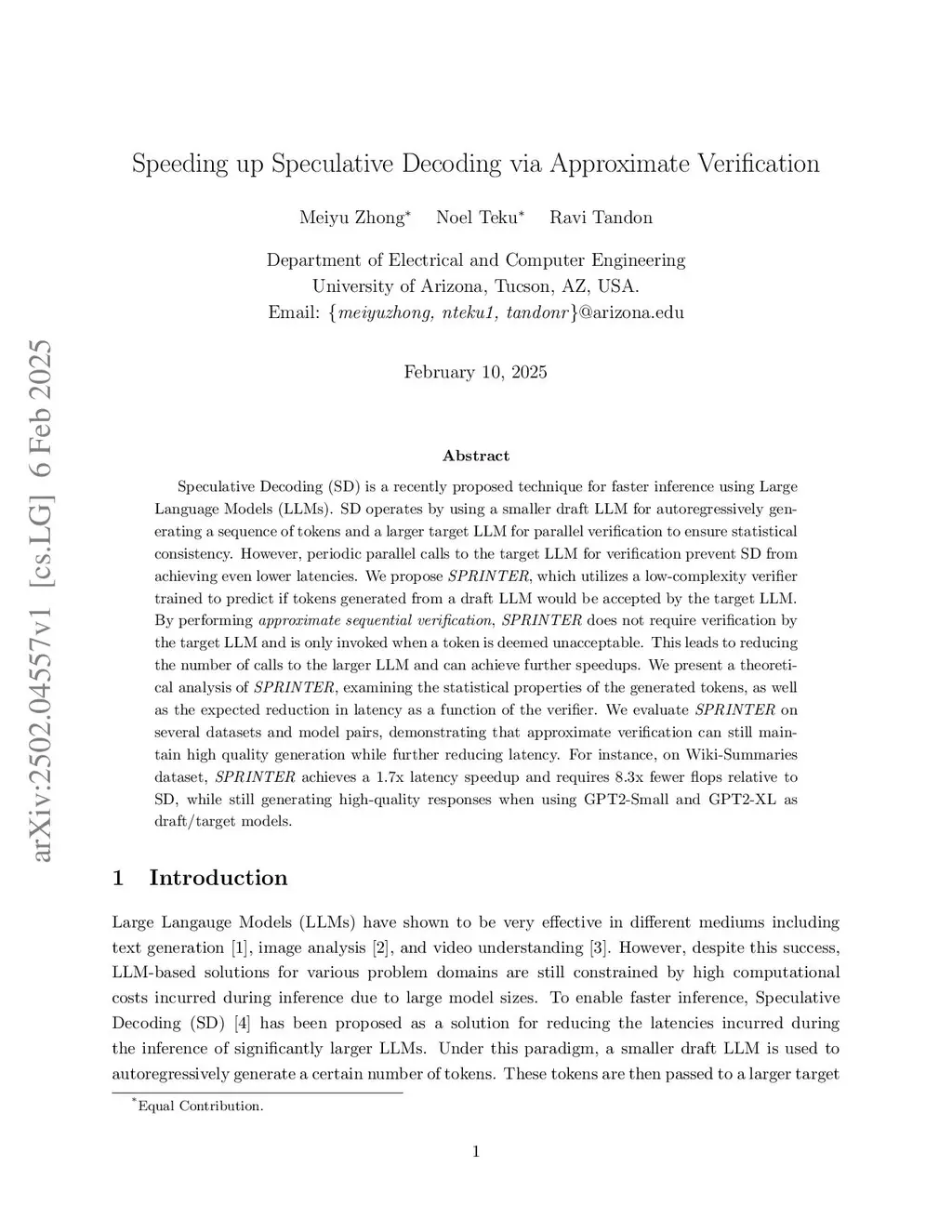 Speculative Decoding (SD) is a recently proposed technique for faster inference using Large Language Models (LLMs). SD operates by using a smaller draft LLM for autoregressively generating a sequence of tokens and a larger target LLM for parallel verification to ensure statistical consistency. However, periodic parallel calls to the target LLM for verification prevent SD from achieving even lower latencies. We propose SPRINTER, which utilizes a low-complexity verifier trained to predict if tokens generated from a draft LLM would be accepted by the target LLM. By performing sequential approximate verification, SPRINTER does not require verification by the target LLM and is only invoked when a token is deemed unacceptable. This reduces the number of calls to the larger LLM, achieving further speedups and lower computation cost. We present a theoretical analysis of SPRINTER, examining the statistical properties of the generated tokens, as well as the expected reduction in latency as a function of the verifier. We evaluate SPRINTER on several datasets and model pairs, demonstrating that approximate verification can still maintain high quality generation while further reducing latency.