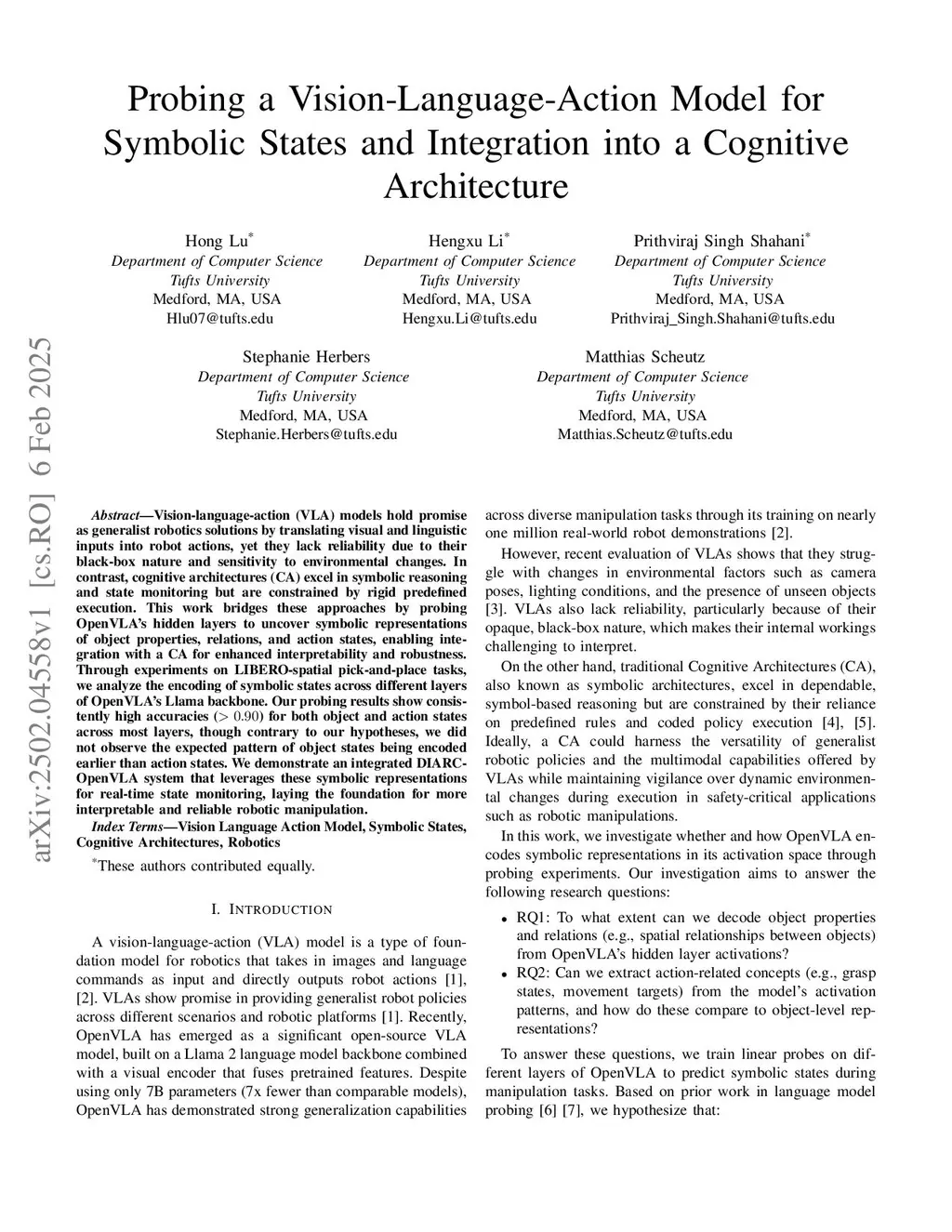 Vision-language-action (VLA) models hold promise as generalist robotics solutions by translating visual and linguistic inputs into robot actions, yet they lack reliability due to their black-box nature and sensitivity to environmental changes. In contrast, cognitive architectures (CA) excel in symbolic reasoning and state monitoring but are constrained by rigid predefined execution. This work bridges these approaches by probing OpenVLA's hidden layers to uncover symbolic representations of object properties, relations, and action states, enabling integration with a CA for enhanced interpretability and robustness. Through experiments on LIBERO-spatial pick-and-place tasks, we analyze the encoding of symbolic states across different layers of OpenVLA's Llama backbone. Our probing results show consistently high accuracies (> 0.90) for both object and action states across most layers, though contrary to our hypotheses, we did not observe the expected pattern of object states being encoded earlier than action states. We demonstrate an integrated DIARC-OpenVLA system that leverages these symbolic representations for real-time state monitoring, laying the foundation for more interpretable and reliable robotic manipulation.