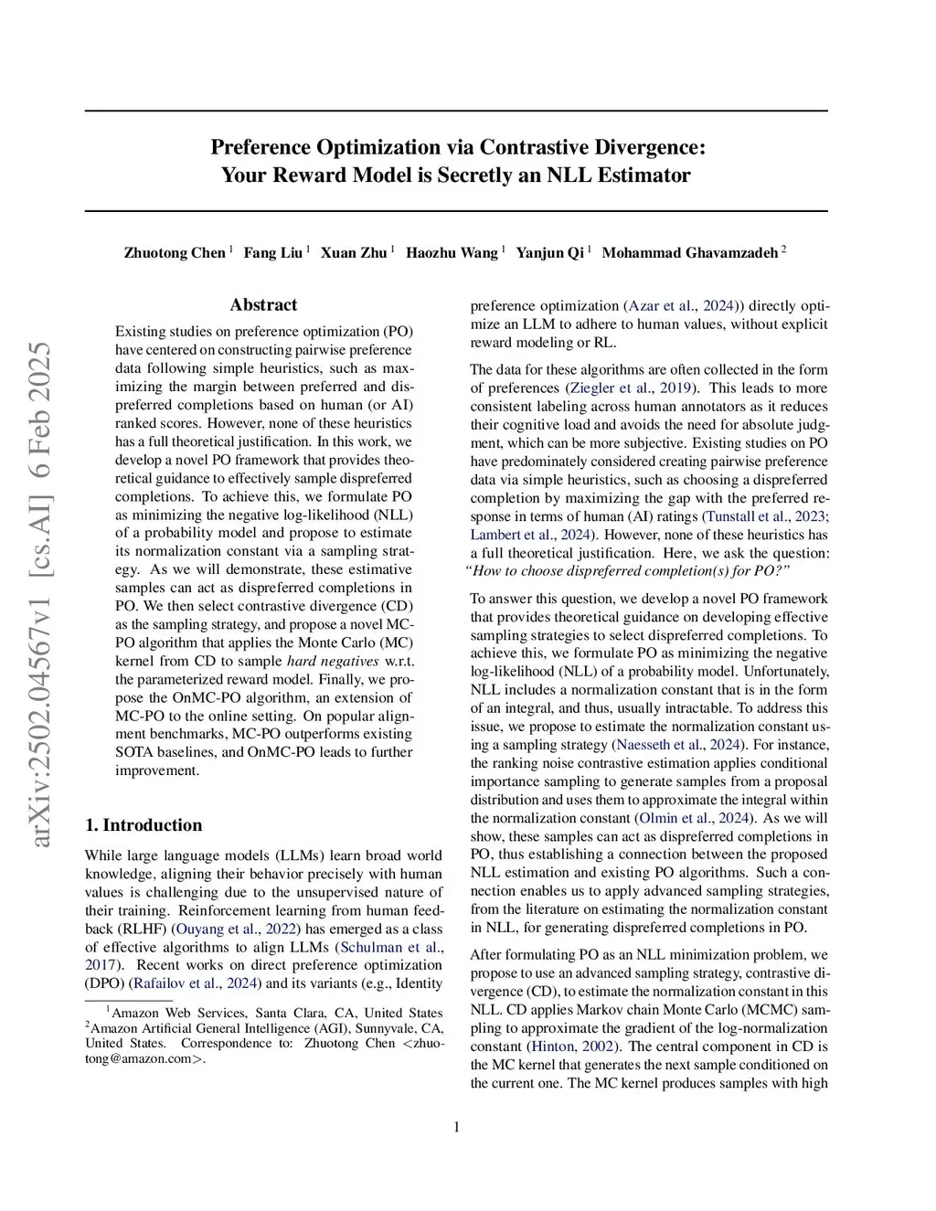 Existing studies on preference optimization (PO) have centered on constructing pairwise preference data following simple heuristics, such as maximizing the margin between preferred and dispreferred completions based on human (or AI) ranked scores. However, none of these heuristics has a full theoretical justification. In this work, we develop a novel PO framework that provides theoretical guidance to effectively sample dispreferred completions. To achieve this, we formulate PO as minimizing the negative log-likelihood (NLL) of a probability model and propose to estimate its normalization constant via a sampling strategy. As we will demonstrate, these estimative samples can act as dispreferred completions in PO. We then select contrastive divergence (CD) as the sampling strategy, and propose a novel MC-PO algorithm that applies the Monte Carlo (MC) kernel from CD to sample hard negatives w.r.t. the parameterized reward model. Finally, we propose the OnMC-PO algorithm, an extension of MC-PO to the online setting. On popular alignment benchmarks, MC-PO outperforms existing SOTA baselines, and OnMC-PO leads to further improvement.