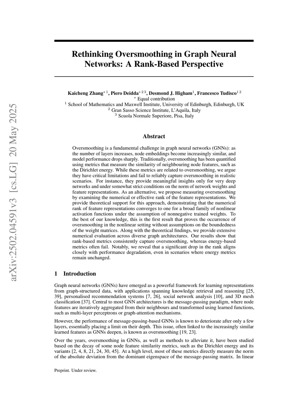 Oversmoothing is a fundamental challenge in graph neural networks (GNNs): as the number of layers increases, node embeddings become increasingly similar, and model performance drops sharply. Traditionally, oversmoothing has been quantified using metrics that measure the similarity of neighbouring node features, such as the Dirichlet energy. We argue that these metrics have critical limitations and fail to reliably capture oversmoothing in realistic scenarios. For instance, they provide meaningful insights only for very deep networks, while typical GNNs show a performance drop already with as few as 10 layers. As an alternative, we propose measuring oversmoothing by examining the numerical or effective rank of the feature representations. We provide extensive numerical evaluation across diverse graph architectures and datasets to show that rank-based metrics consistently capture oversmoothing, whereas energy-based metrics often fail. Notably, we reveal that drops in the rank align closely with performance degradation, even in scenarios where energy metrics remain unchanged. Along with the experimental evaluation, we provide theoretical support for this approach, clarifying why Dirichlet-like measures may fail to capture performance drop and proving that the numerical rank of feature representations collapses to one for a broad family of GNN architectures.
