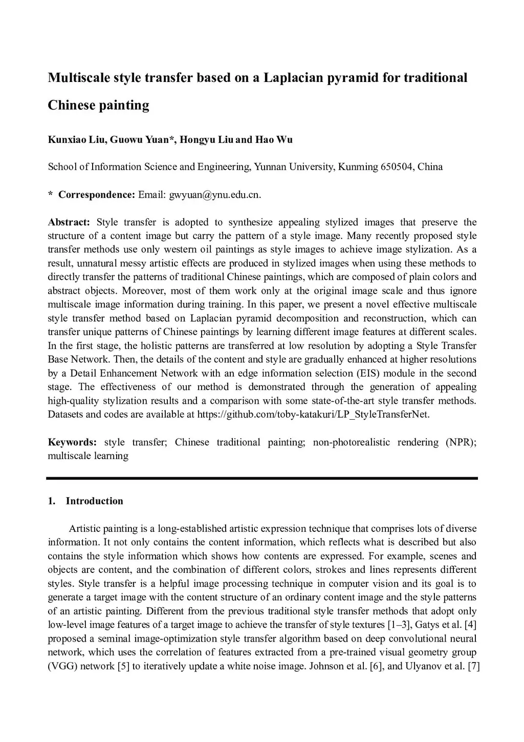 Multiscale style transfer based on a Laplacian pyramid for traditional Chinese painting