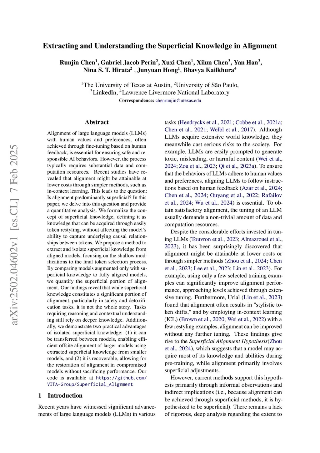 Alignment of large language models (LLMs) with human values and preferences, often achieved through fine-tuning based on human feedback, is essential for ensuring safe and responsible AI behaviors. However, the process typically requires substantial data and computation resources. Recent studies have revealed that alignment might be attainable at lower costs through simpler methods, such as in-context learning. This leads to the question: Is alignment predominantly superficial? In this paper, we delve into this question and provide a quantitative analysis. We formalize the concept of superficial knowledge, defining it as knowledge that can be acquired through easily token restyling, without affecting the model's ability to capture underlying causal relationships between tokens. We propose a method to extract and isolate superficial knowledge from aligned models, focusing on the shallow modifications to the final token selection process. By comparing models augmented only with superficial knowledge to fully aligned models, we quantify the superficial portion of alignment. Our findings reveal that while superficial knowledge constitutes a significant portion of alignment, particularly in safety and detoxification tasks, it is not the whole story. Tasks requiring reasoning and contextual understanding still rely on deeper knowledge. Additionally, we demonstrate two practical advantages of isolated superficial knowledge: (1) it can be transferred between models, enabling efficient offsite alignment of larger models using extracted superficial knowledge from smaller models, and (2) it is recoverable, allowing for the restoration of alignment in compromised models without sacrificing performance.