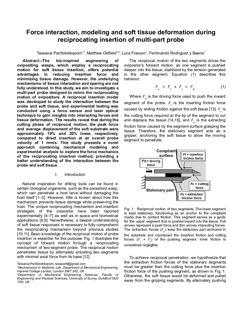 Force interaction, modeling and soft tissue deformation during reciprocating insertion of multi-part probe
