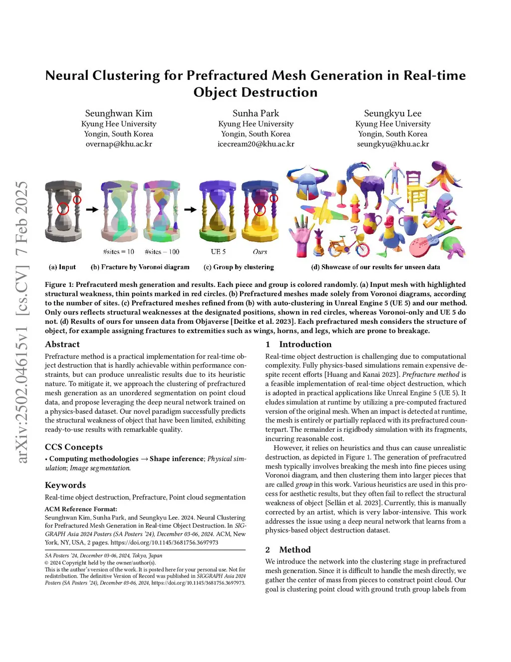 Prefracture method is a practical implementation for real-time object destruction that is hardly achievable within performance constraints, but can produce unrealistic results due to its heuristic nature. To mitigate it, we approach the clustering of prefractured mesh generation as an unordered segmentation on point cloud data, and propose leveraging the deep neural network trained on a physics-based dataset. Our novel paradigm successfully predicts the structural weakness of object that have been limited, exhibiting ready-to-use results with remarkable quality.