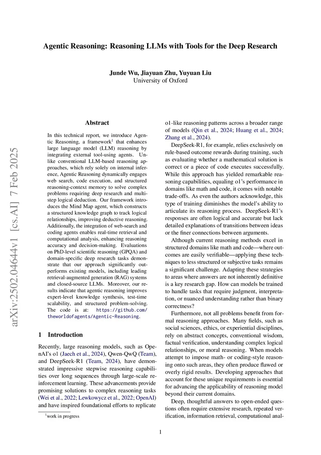 We introduce Agentic Reasoning, a framework that enhances large language model (LLM) reasoning by integrating external tool-using agents. Agentic Reasoning dynamically leverages web search, code execution, and structured memory to address complex problems requiring deep research. A key innovation in our framework is the Mind-Map agent, which constructs a structured knowledge graph to store reasoning context and track logical relationships, ensuring coherence in long reasoning chains with extensive tool usage. Additionally, we conduct a comprehensive exploration of the Web-Search agent, leading to a highly effective search mechanism that surpasses all prior approaches. When deployed on DeepSeek-R1, our method achieves a new state-of-the-art (SOTA) among public models and delivers performance comparable to OpenAI Deep Research, the leading proprietary model in this domain. Extensive ablation studies validate the optimal selection of agentic tools and confirm the effectiveness of our Mind-Map and Web-Search agents in enhancing LLM reasoning. The code is at:this https URL