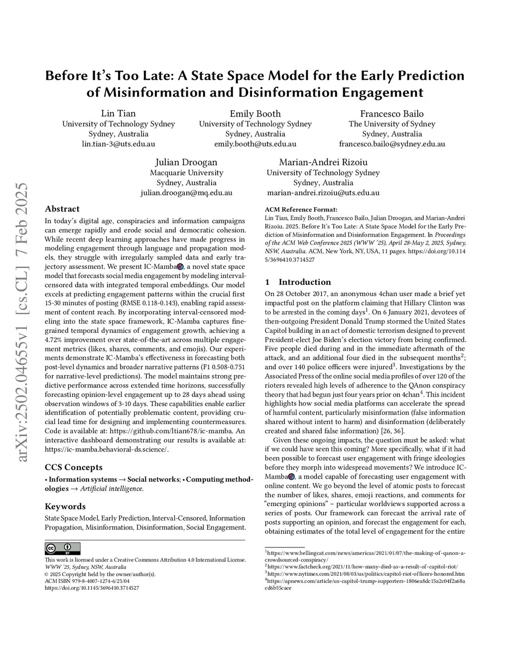In today's digital age, conspiracies and information campaigns can emerge rapidly and erode social and democratic cohesion. While recent deep learning approaches have made progress in modeling engagement through language and propagation models, they struggle with irregularly sampled data and early trajectory assessment. We present IC-Mamba, a novel state space model that forecasts social media engagement by modeling interval-censored data with integrated temporal embeddings. Our model excels at predicting engagement patterns within the crucial first 15-30 minutes of posting (RMSE 0.118-0.143), enabling rapid assessment of content reach. By incorporating interval-censored modeling into the state space framework, IC-Mamba captures fine-grained temporal dynamics of engagement growth, achieving a 4.72% improvement over state-of-the-art across multiple engagement metrics (likes, shares, comments, and emojis). Our experiments demonstrate IC-Mamba's effectiveness in forecasting both post-level dynamics and broader narrative patterns (F1 0.508-0.751 for narrative-level predictions). The model maintains strong predictive performance across extended time horizons, successfully forecasting opinion-level engagement up to 28 days ahead using observation windows of 3-10 days. These capabilities enable earlier identification of potentially problematic content, providing crucial lead time for designing and implementing countermeasures. Code is available at:this https URL. An interactive dashboard demonstrating our results is available at:this https URL.