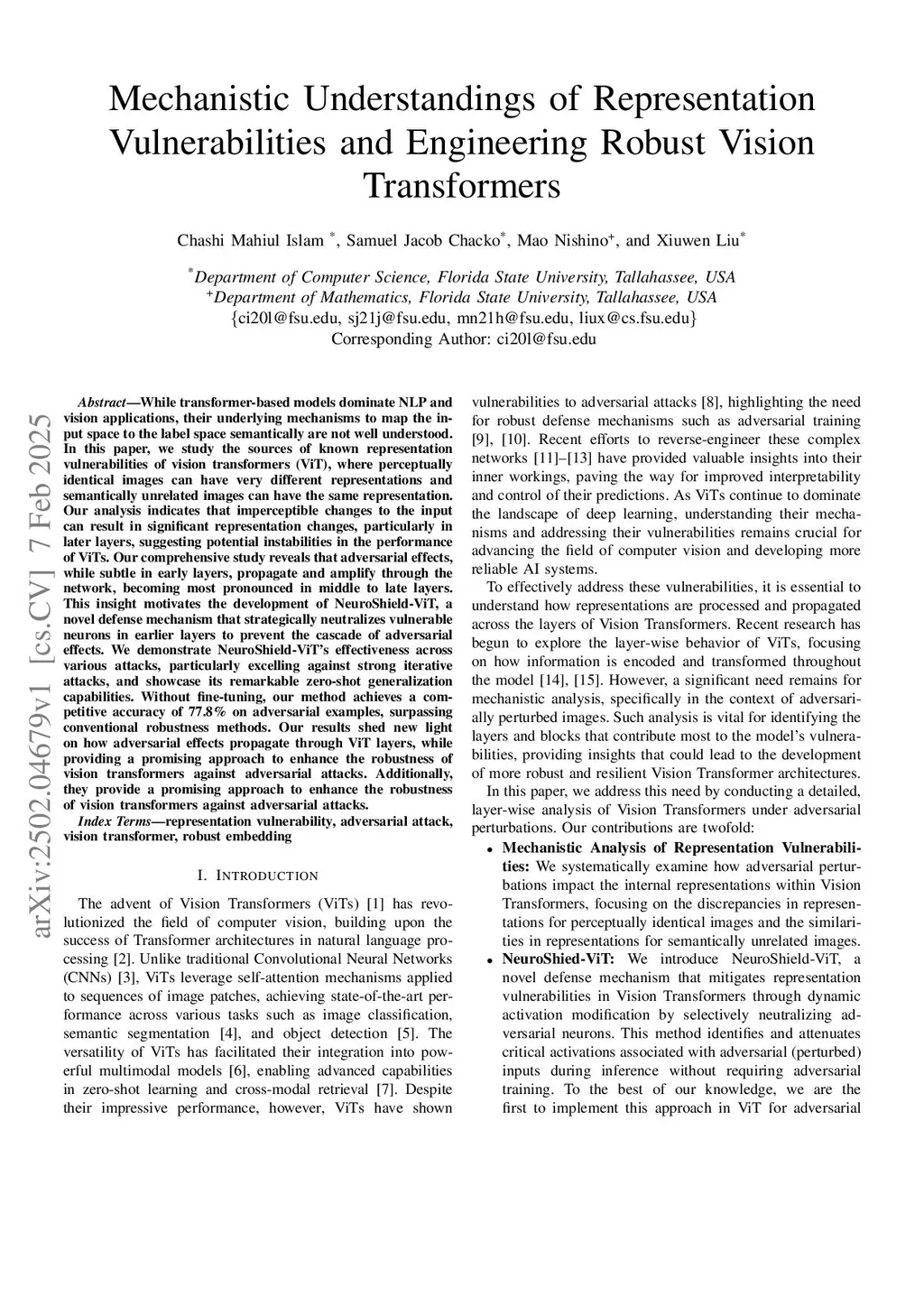 While transformer-based models dominate NLP and vision applications, their underlying mechanisms to map the input space to the label space semantically are not well understood. In this paper, we study the sources of known representation vulnerabilities of vision transformers (ViT), where perceptually identical images can have very different representations and semantically unrelated images can have the same representation. Our analysis indicates that imperceptible changes to the input can result in significant representation changes, particularly in later layers, suggesting potential instabilities in the performance of ViTs. Our comprehensive study reveals that adversarial effects, while subtle in early layers, propagate and amplify through the network, becoming most pronounced in middle to late layers. This insight motivates the development of NeuroShield-ViT, a novel defense mechanism that strategically neutralizes vulnerable neurons in earlier layers to prevent the cascade of adversarial effects. We demonstrate NeuroShield-ViT's effectiveness across various attacks, particularly excelling against strong iterative attacks, and showcase its remarkable zero-shot generalization capabilities. Without fine-tuning, our method achieves a competitive accuracy of 77.8% on adversarial examples, surpassing conventional robustness methods. Our results shed new light on how adversarial effects propagate through ViT layers, while providing a promising approach to enhance the robustness of vision transformers against adversarial attacks. Additionally, they provide a promising approach to enhance the robustness of vision transformers against adversarial attacks.