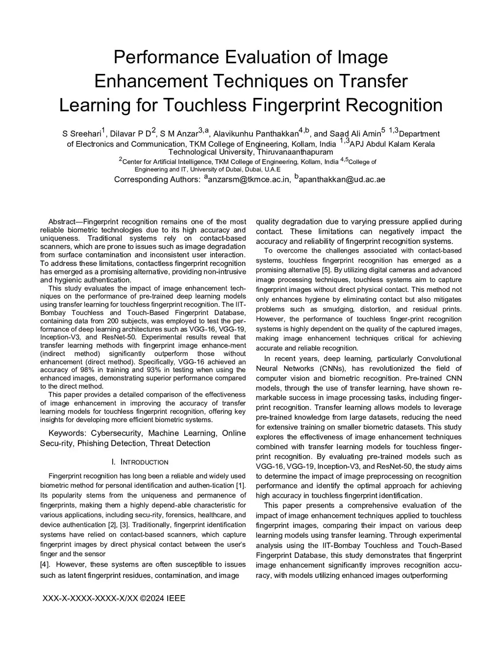 Fingerprint recognition remains one of the most reliable biometric technologies due to its high accuracy and uniqueness. Traditional systems rely on contact-based scanners, which are prone to issues such as image degradation from surface contamination and inconsistent user interaction. To address these limitations, contactless fingerprint recognition has emerged as a promising alternative, providing non-intrusive and hygienic authentication. This study evaluates the impact of image enhancement tech-niques on the performance of pre-trained deep learning models using transfer learning for touchless fingerprint recognition. The IIT-Bombay Touchless and Touch-Based Fingerprint Database, containing data from 200 subjects, was employed to test the per-formance of deep learning architectures such as VGG-16, VGG-19, Inception-V3, and ResNet-50. Experimental results reveal that transfer learning methods with fingerprint image enhance-ment (indirect method) significantly outperform those without enhancement (direct method). Specifically, VGG-16 achieved an accuracy of 98% in training and 93% in testing when using the enhanced images, demonstrating superior performance compared to the direct method.This paper provides a detailed comparison of the effectiveness of image enhancement in improving the accuracy of transfer learning models for touchless fingerprint recognition, offering key insights for developing more efficient biometric systems.