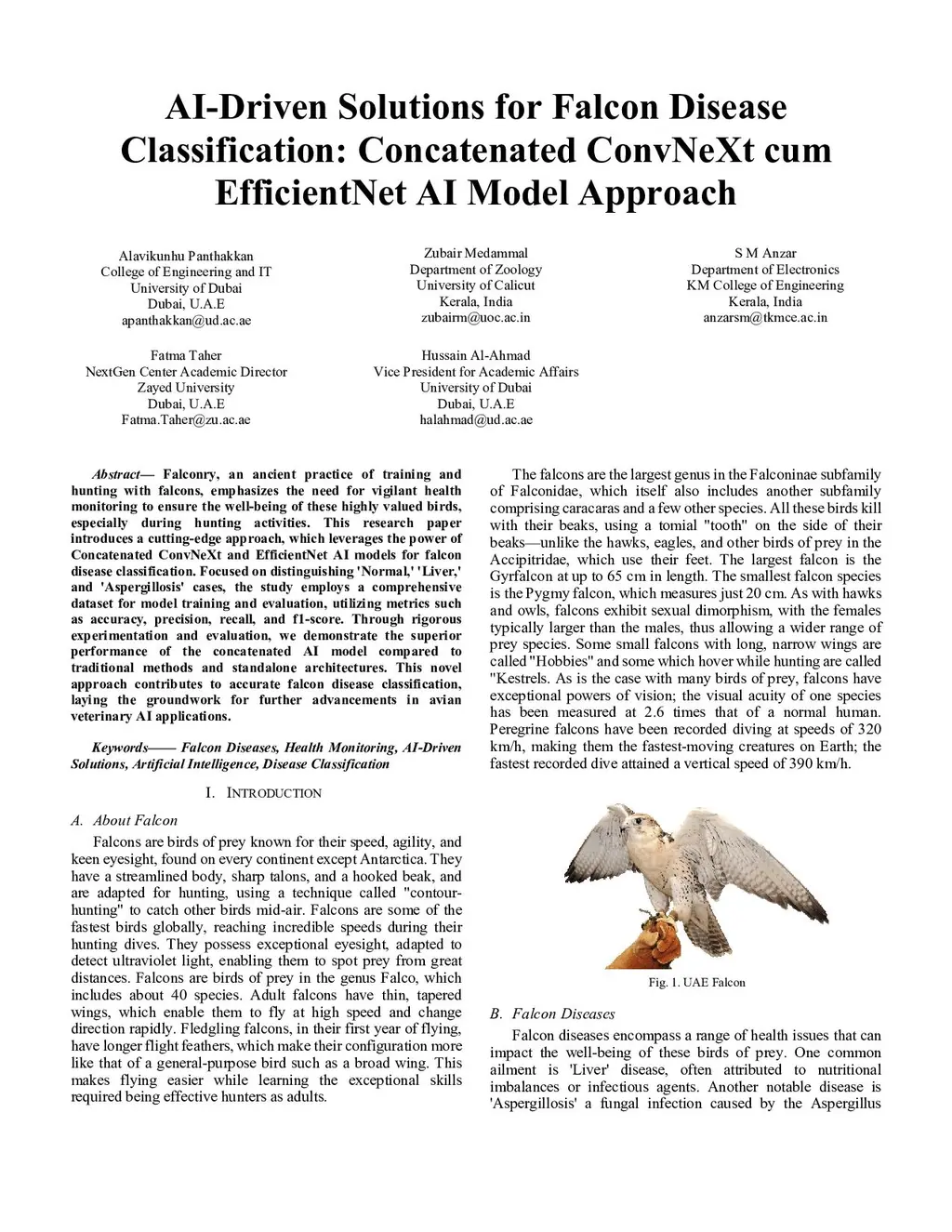 Falconry, an ancient practice of training and hunting with falcons, emphasizes the need for vigilant health monitoring to ensure the well-being of these highly valued birds, especially during hunting activities. This research paper introduces a cutting-edge approach, which leverages the power of Concatenated ConvNeXt and EfficientNet AI models for falcon disease classification. Focused on distinguishing Ñormal,' 'Liver,' and Áspergillosis' cases, the study employs a comprehensive dataset for model training and evaluation, utilizing metrics such as accuracy, precision, recall, and f1-score. Through rigorous experimentation and evaluation, we demonstrate the superior performance of the concatenated AI model compared to traditional methods and standalone architectures. This novel approach contributes to accurate falcon disease classification, laying the groundwork for further advancements in avian veterinary AI applications.