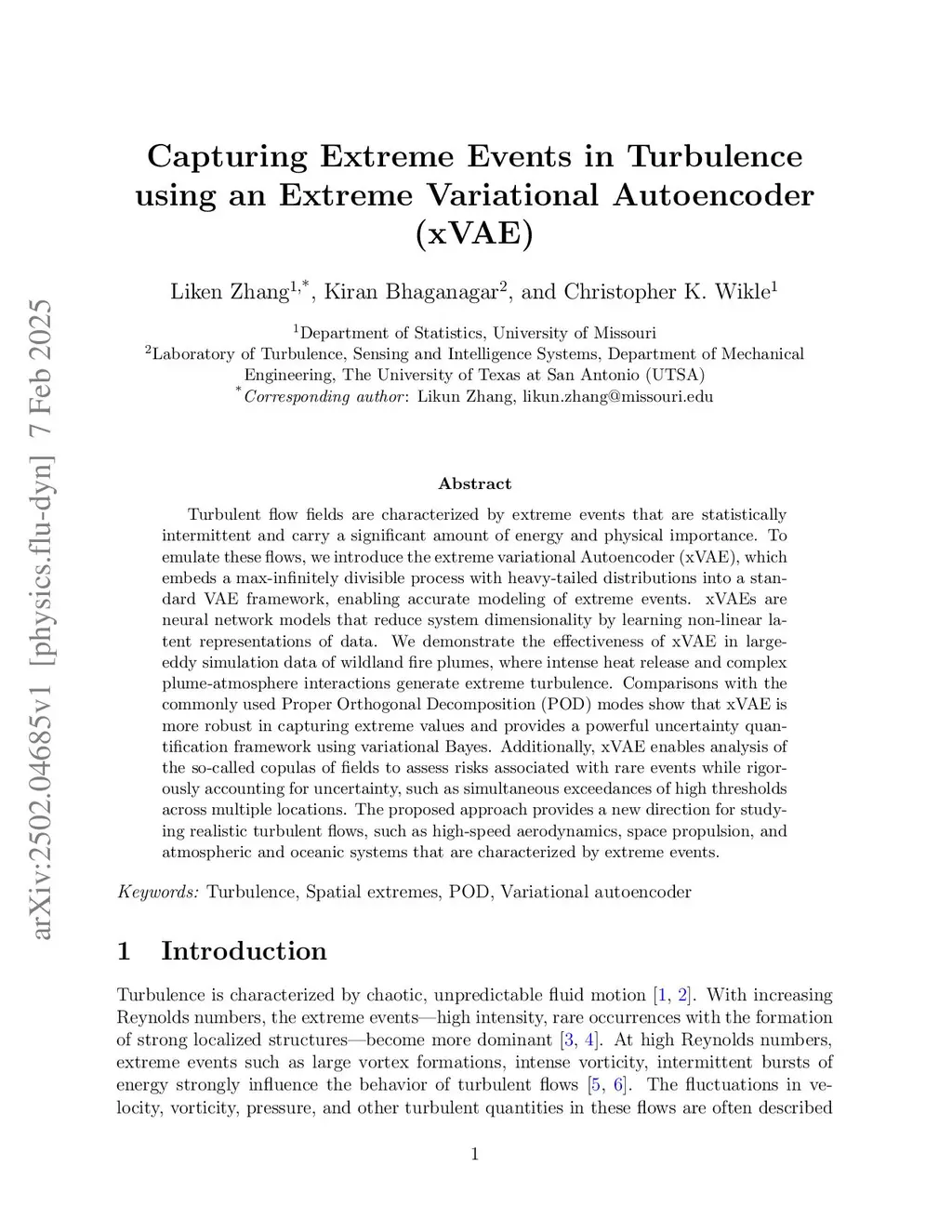 Turbulent flow fields are characterized by extreme events that are statistically intermittent and carry a significant amount of energy and physical importance. To emulate these flows, we introduce the extreme variational Autoencoder (xVAE), which embeds a max-infinitely divisible process with heavy-tailed distributions into a standard VAE framework, enabling accurate modeling of extreme events. xVAEs are neural network models that reduce system dimensionality by learning non-linear latent representations of data. We demonstrate the effectiveness of xVAE in large-eddy simulation data of wildland fire plumes, where intense heat release and complex plume-atmosphere interactions generate extreme turbulence. Comparisons with the commonly used Proper Orthogonal Decomposition (POD) modes show that xVAE is more robust in capturing extreme values and provides a powerful uncertainty quantification framework using variational Bayes. Additionally, xVAE enables analysis of the so-called copulas of fields to assess risks associated with rare events while rigorously accounting for uncertainty, such as simultaneous exceedances of high thresholds across multiple locations. The proposed approach provides a new direction for studying realistic turbulent flows, such as high-speed aerodynamics, space propulsion, and atmospheric and oceanic systems that are characterized by extreme events.