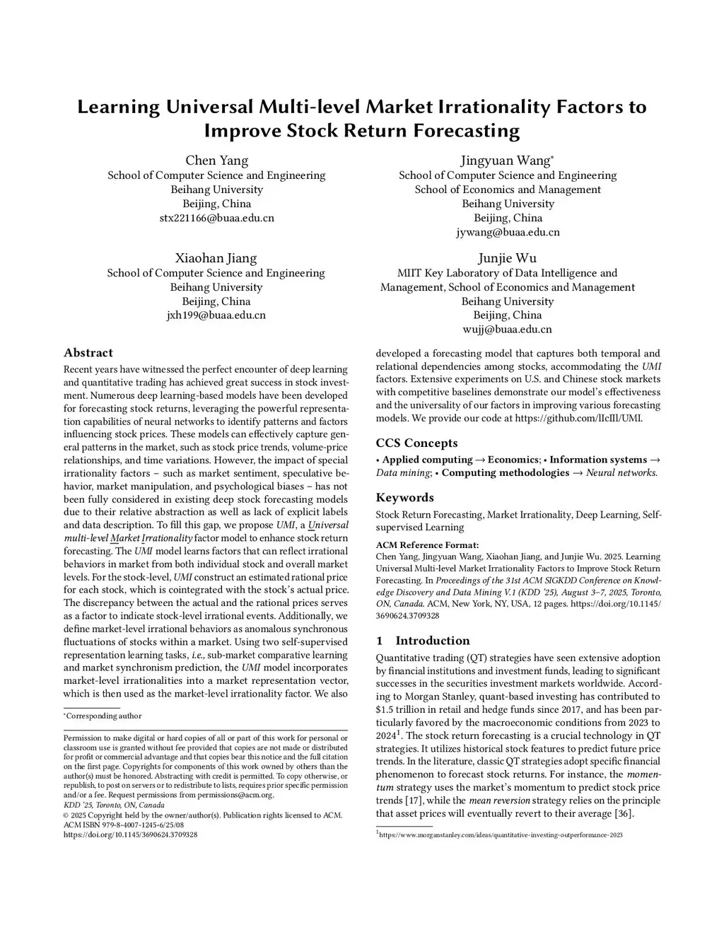 Recent years have witnessed the perfect encounter of deep learning and quantitative trading has achieved great success in stock investment. Numerous deep learning-based models have been developed for forecasting stock returns, leveraging the powerful representation capabilities of neural networks to identify patterns and factors influencing stock prices. These models can effectively capture general patterns in the market, such as stock price trends, volume-price relationships, and time variations. However, the impact of special irrationality factors -- such as market sentiment, speculative behavior, market manipulation, and psychological biases -- have not been fully considered in existing deep stock forecasting models due to their relative abstraction as well as lack of explicit labels and data description. To fill this gap, we propose UMI, a Universal multi-level Market Irrationality factor model to enhance stock return forecasting. The UMI model learns factors that can reflect irrational behaviors in market from both individual stock and overall market levels. For the stock-level, UMI construct an estimated rational price for each stock, which is cointegrated with the stock's actual price. The discrepancy between the actual and the rational prices serves as a factor to indicate stock-level irrational events. Additionally, we define market-level irrational behaviors as anomalous synchronous fluctuations of stocks within a market. Using two self-supervised representation learning tasks, i.e., sub-market comparative learning and market synchronism prediction, the UMI model incorporates market-level irrationalities into a market representation vector, which is then used as the market-level irrationality factor.