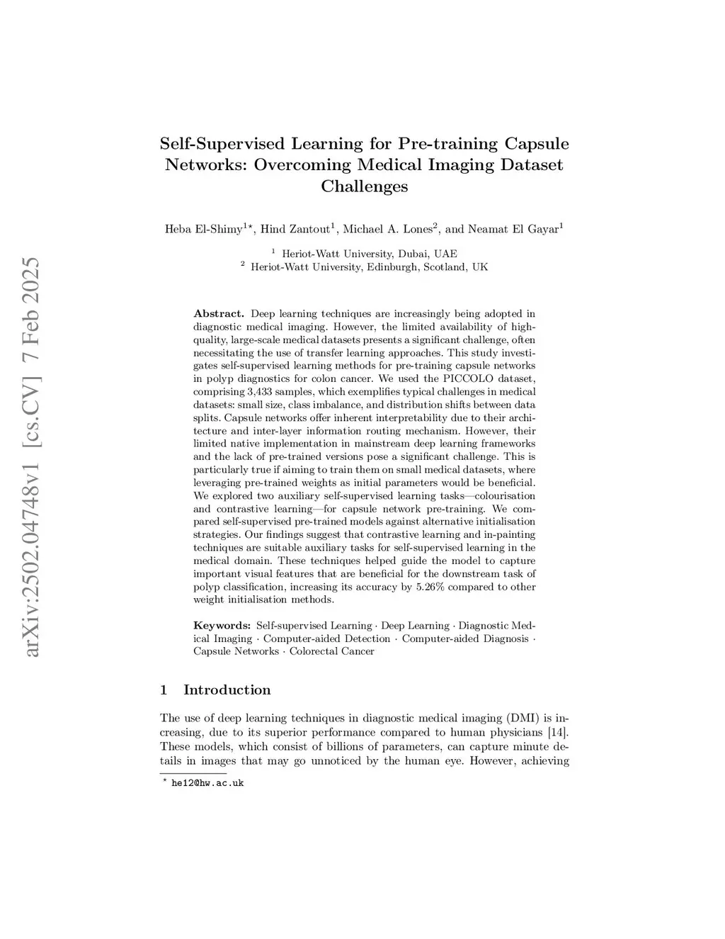 Deep learning techniques are increasingly being adopted in diagnostic medical imaging. However, the limited availability of high-quality, large-scale medical datasets presents a significant challenge, often necessitating the use of transfer learning approaches. This study investigates self-supervised learning methods for pre-training capsule networks in polyp diagnostics for colon cancer. We used the PICCOLO dataset, comprising 3,433 samples, which exemplifies typical challenges in medical datasets: small size, class imbalance, and distribution shifts between data splits. Capsule networks offer inherent interpretability due to their architecture and inter-layer information routing mechanism. However, their limited native implementation in mainstream deep learning frameworks and the lack of pre-trained versions pose a significant challenge. This is particularly true if aiming to train them on small medical datasets, where leveraging pre-trained weights as initial parameters would be beneficial. We explored two auxiliary self-supervised learning tasks, colourisation and contrastive learning, for capsule network pre-training. We compared self-supervised pre-trained models against alternative initialisation strategies. Our findings suggest that contrastive learning and in-painting techniques are suitable auxiliary tasks for self-supervised learning in the medical domain. These techniques helped guide the model to capture important visual features that are beneficial for the downstream task of polyp classification, increasing its accuracy by 5.26% compared to other weight initialisation methods.