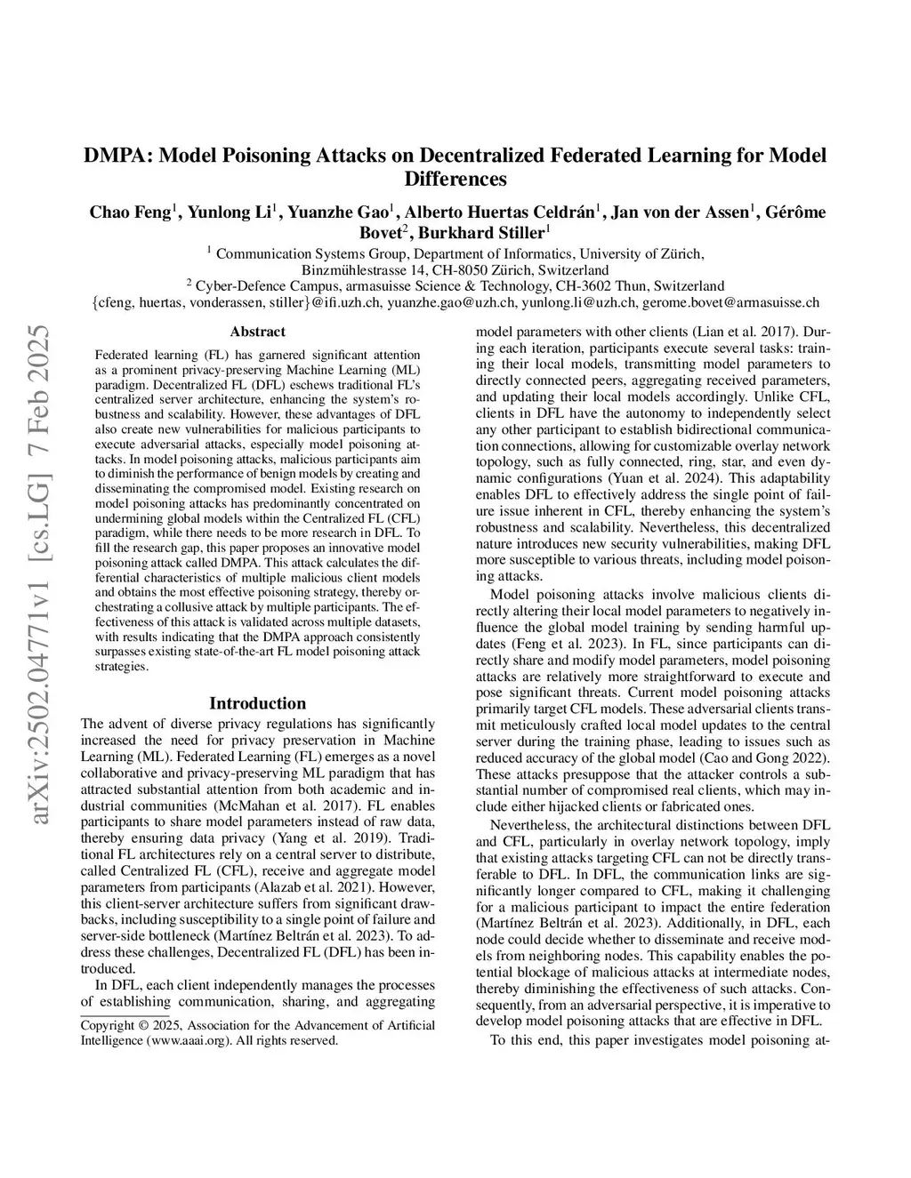 Federated learning (FL) has garnered significant attention as a prominent privacy-preserving Machine Learning (ML) paradigm. Decentralized FL (DFL) eschews traditional FL's centralized server architecture, enhancing the system's robustness and scalability. However, these advantages of DFL also create new vulnerabilities for malicious participants to execute adversarial attacks, especially model poisoning attacks. In model poisoning attacks, malicious participants aim to diminish the performance of benign models by creating and disseminating the compromised model. Existing research on model poisoning attacks has predominantly concentrated on undermining global models within the Centralized FL (CFL) paradigm, while there needs to be more research in DFL. To fill the research gap, this paper proposes an innovative model poisoning attack called DMPA. This attack calculates the differential characteristics of multiple malicious client models and obtains the most effective poisoning strategy, thereby orchestrating a collusive attack by multiple participants. The effectiveness of this attack is validated across multiple datasets, with results indicating that the DMPA approach consistently surpasses existing state-of-the-art FL model poisoning attack strategies.
