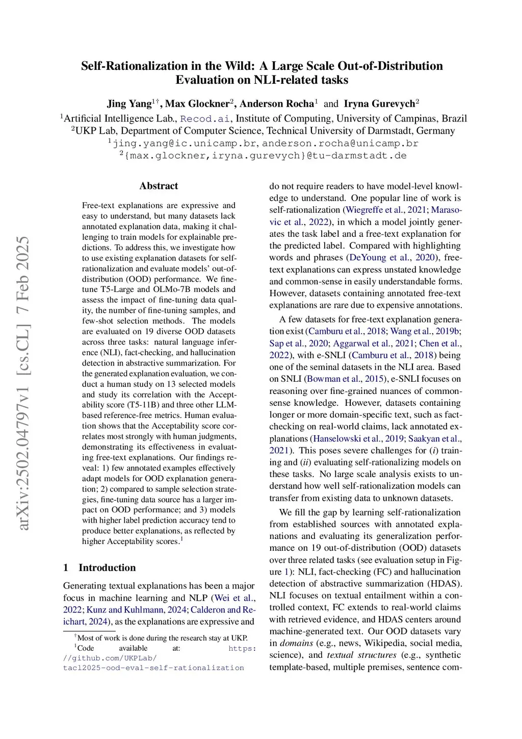 Free-text explanations are expressive and easy to understand, but many datasets lack annotated explanation data, making it challenging to train models for explainable predictions. To address this, we investigate how to use existing explanation datasets for self-rationalization and evaluate models' out-of-distribution (OOD) performance. We fine-tune T5-Large and OLMo-7B models and assess the impact of fine-tuning data quality, the number of fine-tuning samples, and few-shot selection methods. The models are evaluated on 19 diverse OOD datasets across three tasks: natural language inference (NLI), fact-checking, and hallucination detection in abstractive summarization. For the generated explanation evaluation, we conduct a human study on 13 selected models and study its correlation with the Acceptability score (T5-11B) and three other LLM-based reference-free metrics. Human evaluation shows that the Acceptability score correlates most strongly with human judgments, demonstrating its effectiveness in evaluating free-text explanations. Our findings reveal: 1) few annotated examples effectively adapt models for OOD explanation generation; 2) compared to sample selection strategies, fine-tuning data source has a larger impact on OOD performance; and 3) models with higher label prediction accuracy tend to produce better explanations, as reflected by higher Acceptability scores.