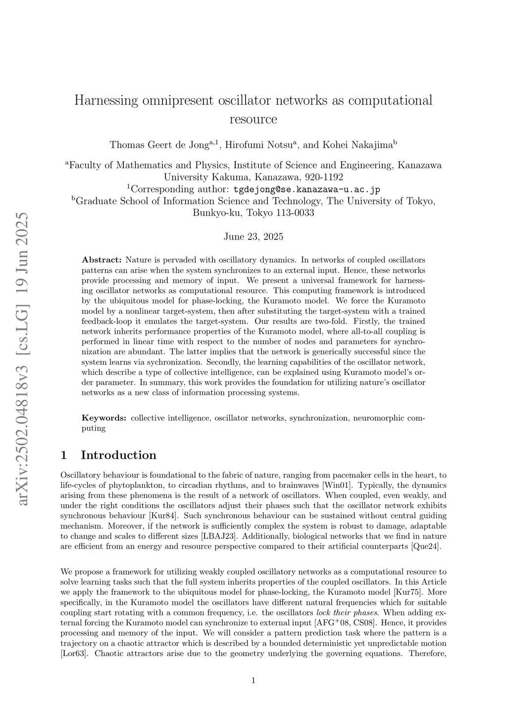 Nature is pervaded with oscillatory dynamics. In networks of coupled oscillators patterns can arise when the system synchronizes to an external input. Hence, these networks provide processing and memory of input. We present a universal framework for harnessing oscillator networks as computational resource. This computing framework is introduced by the ubiquitous model for phase-locking, the Kuramoto model. We force the Kuramoto model by a nonlinear target-system, then after substituting the target-system with a trained feedback-loop it emulates the target-system. Our results are two-fold. Firstly, the trained network inherits performance properties of the Kuramoto model, where all-to-all coupling is performed in linear time with respect to the number of nodes and parameters for synchronization are abundant. The latter implies that the network is generically successful since the system learns via sychronization. Secondly, the learning capabilities of the oscillator network, which describe a type of collective intelligence, can be explained using Kuramoto model's order parameter. In summary, this work provides the foundation for utilizing nature's oscillator networks as a new class of information processing systems.