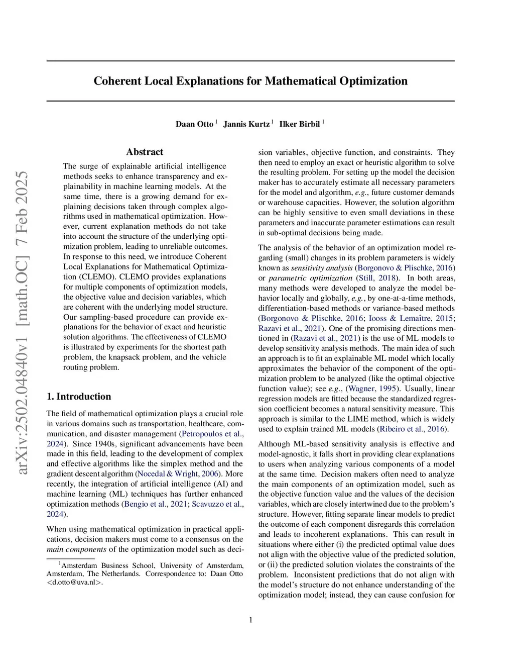 The surge of explainable artificial intelligence methods seeks to enhance transparency and explainability in machine learning models. At the same time, there is a growing demand for explaining decisions taken through complex algorithms used in mathematical optimization. However, current explanation methods do not take into account the structure of the underlying optimization problem, leading to unreliable outcomes. In response to this need, we introduce Coherent Local Explanations for Mathematical Optimization (CLEMO). CLEMO provides explanations for multiple components of optimization models, the objective value and decision variables, which are coherent with the underlying model structure. Our sampling-based procedure can provide explanations for the behavior of exact and heuristic solution algorithms. The effectiveness of CLEMO is illustrated by experiments for the shortest path problem, the knapsack problem, and the vehicle routing problem.