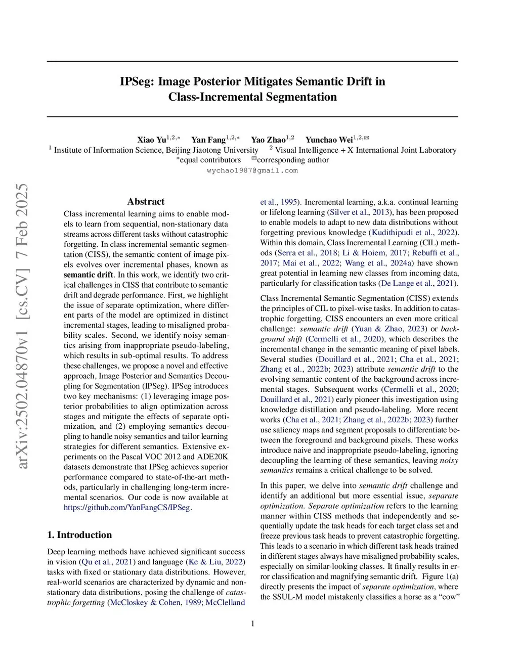 Class incremental learning aims to enable models to learn from sequential, non-stationary data streams across different tasks without catastrophic forgetting. In class incremental semantic segmentation (CISS), the semantic content of image pixels evolves over incremental phases, known as semantic drift. In this work, we identify two critical challenges in CISS that contribute to semantic drift and degrade performance. First, we highlight the issue of separate optimization, where different parts of the model are optimized in distinct incremental stages, leading to misaligned probability scales. Second, we identify noisy semantics arising from inappropriate pseudo-labeling, which results in sub-optimal results. To address these challenges, we propose a novel and effective approach, Image Posterior and Semantics Decoupling for Segmentation (IPSeg). IPSeg introduces two key mechanisms: (1) leveraging image posterior probabilities to align optimization across stages and mitigate the effects of separate optimization, and (2) employing semantics decoupling to handle noisy semantics and tailor learning strategies for different semantics. Extensive experiments on the Pascal VOC 2012 and ADE20K datasets demonstrate that IPSeg achieves superior performance compared to state-of-the-art methods, particularly in challenging long-term incremental scenarios.