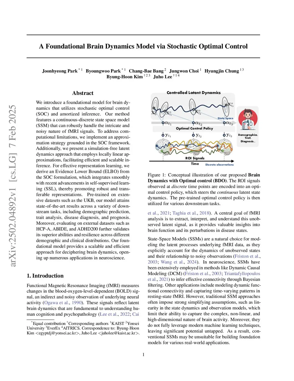We introduce a foundational model for brain dynamics that utilizes stochastic optimal control (SOC) and amortized inference. Our method features a continuous-discrete state space model (SSM) that can robustly handle the intricate and noisy nature of fMRI signals. To address computational limitations, we implement an approximation strategy grounded in the SOC framework. Additionally, we present a simulation-free latent dynamics approach that employs locally linear approximations, facilitating efficient and scalable inference. For effective representation learning, we derive an Evidence Lower Bound (ELBO) from the SOC formulation, which integrates smoothly with recent advancements in self-supervised learning (SSL), thereby promoting robust and transferable representations. Pre-trained on extensive datasets such as the UKB, our model attains state-of-the-art results across a variety of downstream tasks, including demographic prediction, trait analysis, disease diagnosis, and prognosis. Moreover, evaluating on external datasets such as HCP-A, ABIDE, and ADHD200 further validates its superior abilities and resilience across different demographic and clinical distributions. Our foundational model provides a scalable and efficient approach for deciphering brain dynamics, opening up numerous applications in neuroscience.
