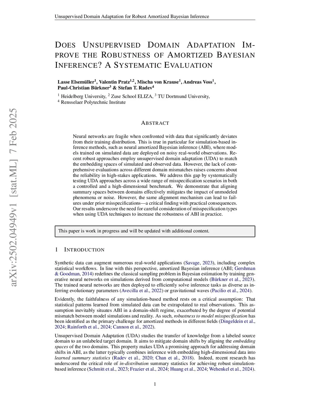 Neural networks are fragile when confronted with data that significantly deviates from their training distribution. This is true in particular for simulation-based inference methods, such as neural amortized Bayesian inference (ABI), where models trained on simulated data are deployed on noisy real-world observations. Recent robust approaches employ unsupervised domain adaptation (UDA) to match the embedding spaces of simulated and observed data. However, the lack of comprehensive evaluations across different domain mismatches raises concerns about the reliability in high-stakes applications. We address this gap by systematically testing UDA approaches across a wide range of misspecification scenarios in silico and practice. We demonstrate that aligning summary spaces between domains effectively mitigates the impact of unmodeled phenomena or noise. However, the same alignment mechanism can lead to failures under prior misspecifications - a critical finding with practical consequences. Our results underscore the need for careful consideration of misspecification types when using UDA to increase the robustness of ABI.