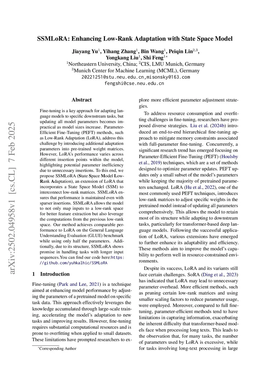 Fine-tuning is a key approach for adapting language models to specific downstream tasks, but updating all model parameters becomes impractical as model sizes increase. Parameter-Efficient Fine-Tuning (PEFT) methods, such as Low-Rank Adaptation (LoRA), address this challenge by introducing additional adaptation parameters into pre-trained weight matrices. However, LoRA's performance varies across different insertion points within the model, highlighting potential parameter inefficiency due to unnecessary insertions. To this end, we propose SSMLoRA (State Space Model Low-Rank Adaptation), an extension of LoRA that incorporates a State Space Model (SSM) to interconnect low-rank matrices. SSMLoRA ensures that performance is maintained even with sparser insertions. SSMLoRA allows the model to not only map inputs to a low-rank space for better feature extraction but also leverage the computations from the previous low-rank space. Our method achieves comparable performance to LoRA on the General Language Understanding Evaluation (GLUE) benchmark while using only half the parameters. Additionally, due to its structure, SSMLoRA shows promise in handling tasks with longer input sequences. .You can find our code here:this https URL.