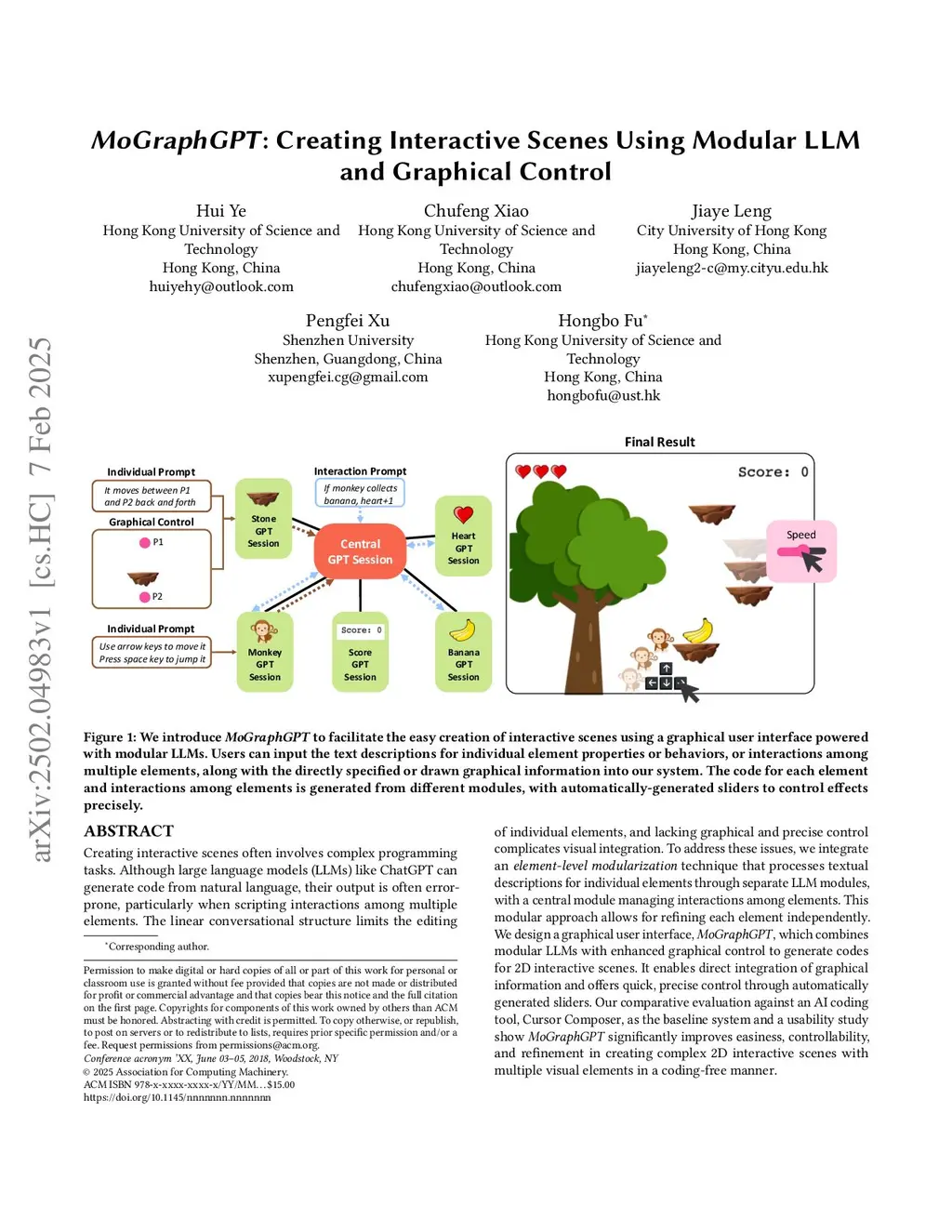 Creating interactive scenes often involves complex programming tasks. Although large language models (LLMs) like ChatGPT can generate code from natural language, their output is often error-prone, particularly when scripting interactions among multiple elements. The linear conversational structure limits the editing of individual elements, and lacking graphical and precise control complicates visual integration. To address these issues, we integrate an element-level modularization technique that processes textual descriptions for individual elements through separate LLM modules, with a central module managing interactions among elements. This modular approach allows for refining each element independently. We design a graphical user interface, MoGraphGPT , which combines modular LLMs with enhanced graphical control to generate codes for 2D interactive scenes. It enables direct integration of graphical information and offers quick, precise control through automatically generated sliders. Our comparative evaluation against an AI coding tool, Cursor Composer, as the baseline system and a usability study show MoGraphGPT significantly improves easiness, controllability, and refinement in creating complex 2D interactive scenes with multiple visual elements in a coding-free manner.