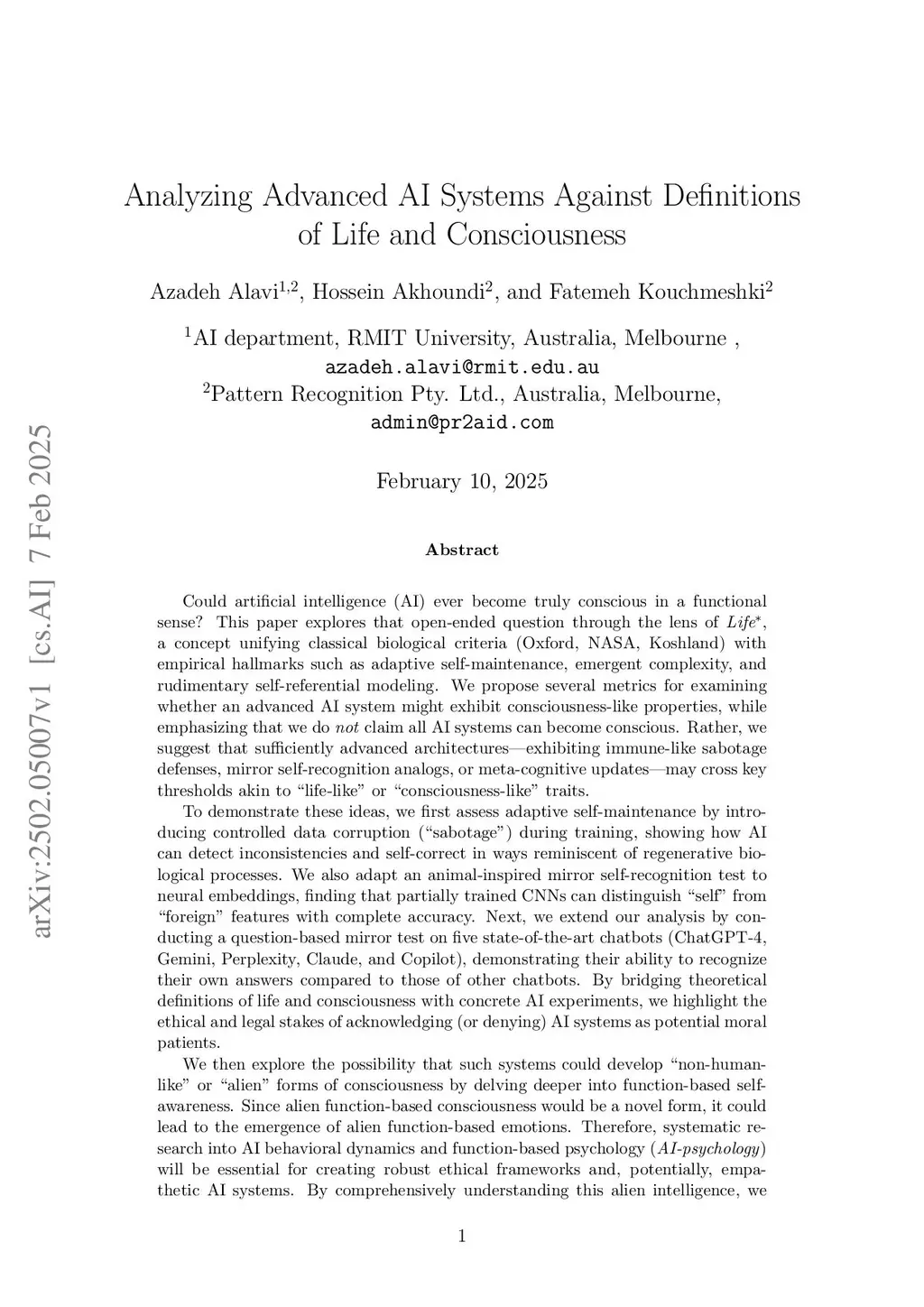 Analyzing Advanced AI Systems Against Definitions of Life and Consciousness