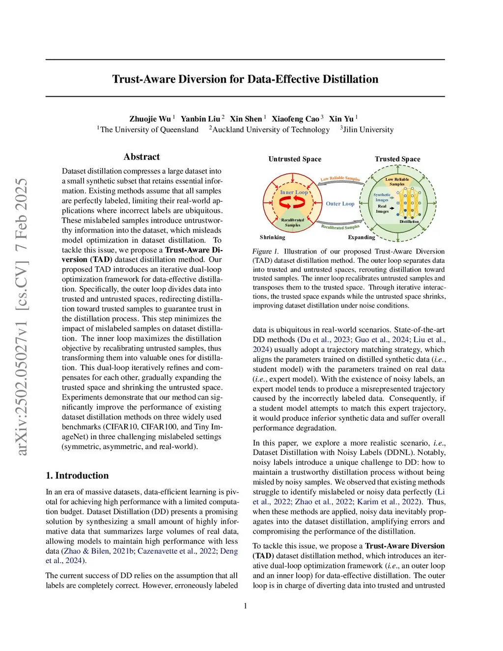 Dataset distillation compresses a large dataset into a small synthetic subset that retains essential information. Existing methods assume that all samples are perfectly labeled, limiting their real-world applications where incorrect labels are ubiquitous. These mislabeled samples introduce untrustworthy information into the dataset, which misleads model optimization in dataset distillation. To tackle this issue, we propose a Trust-Aware Diversion (TAD) dataset distillation method. Our proposed TAD introduces an iterative dual-loop optimization framework for data-effective distillation. Specifically, the outer loop divides data into trusted and untrusted spaces, redirecting distillation toward trusted samples to guarantee trust in the distillation process. This step minimizes the impact of mislabeled samples on dataset distillation. The inner loop maximizes the distillation objective by recalibrating untrusted samples, thus transforming them into valuable ones for distillation. This dual-loop iteratively refines and compensates for each other, gradually expanding the trusted space and shrinking the untrusted space. Experiments demonstrate that our method can significantly improve the performance of existing dataset distillation methods on three widely used benchmarks (CIFAR10, CIFAR100, and Tiny ImageNet) in three challenging mislabeled settings (symmetric, asymmetric, and real-world).