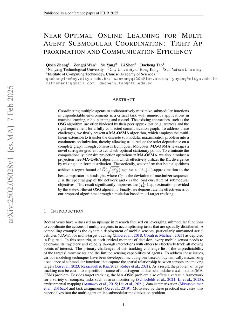 Coordinating multiple agents to collaboratively maximize submodular functions in unpredictable environments is a critical task with numerous applications in machine learning, robot planning and control. The existing approaches, such as the OSG algorithm, are often hindered by their poor approximation guarantees and the rigid requirement for a fully connected communication graph. To address these challenges, we firstly present a algorithm, which employs the multi-linear extension to transfer the discrete submodular maximization problem into a continuous optimization, thereby allowing us to reduce the strict dependence on a complete graph through consensus techniques. Moreover, leverages a novel surrogate gradient to avoid sub-optimal stationary points. To eliminate the computationally intensive projection operations in , we also introduce a projection-free algorithm, which effectively utilizes the KL divergence by mixing a uniform distribution. Theoretically, we confirm that both algorithms achieve a regret bound of against a -approximation to the best comparator in hindsight, where is the deviation of maximizer sequence, is the spectral gap of the network and is the joint curvature of submodular objectives. This result significantly improves the -approximation provided by the state-of-the-art OSG algorithm. Finally, we demonstrate the effectiveness of our proposed algorithms through simulation-based multi-target tracking.