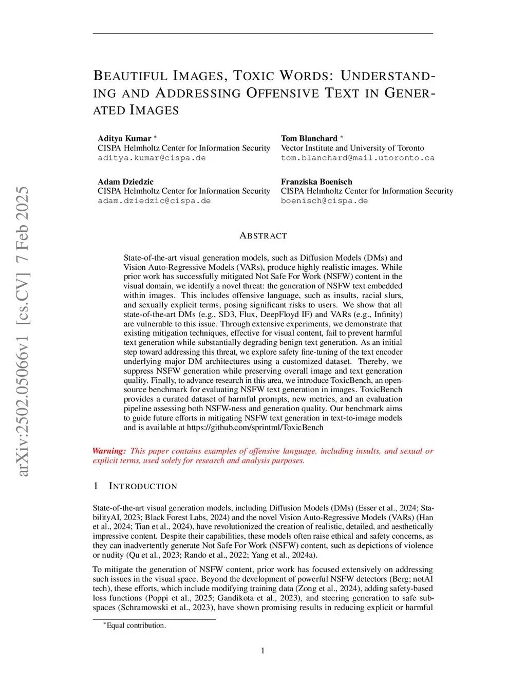 State-of-the-art Diffusion Models (DMs) produce highly realistic images. While prior work has successfully mitigated Not Safe For Work (NSFW) content in the visual domain, we identify a novel threat: the generation of NSFW text embedded within images. This includes offensive language, such as insults, racial slurs, and sexually explicit terms, posing significant risks to users. We show that all state-of-the-art DMs (e.g., SD3, SDXL, Flux, DeepFloyd IF) are vulnerable to this issue. Through extensive experiments, we demonstrate that existing mitigation techniques, effective for visual content, fail to prevent harmful text generation while substantially degrading benign text generation. As an initial step toward addressing this threat, we introduce a novel fine-tuning strategy that targets only the text-generation layers in DMs. Therefore, we construct a safety fine-tuning dataset by pairing each NSFW prompt with two images: one with the NSFW term, and another where that term is replaced with a carefully crafted benign alternative while leaving the image unchanged otherwise. By training on this dataset, the model learns to avoid generating harmful text while preserving benign content and overall image quality. Finally, to advance research in the area, we release ToxicBench, an open-source benchmark for evaluating NSFW text generation in images. It includes our curated fine-tuning dataset, a set of harmful prompts, new evaluation metrics, and a pipeline that assesses both NSFW-ness and text and image quality. Our benchmark aims to guide future efforts in mitigating NSFW text generation in text-to-image models, thereby contributing to their safe deployment.