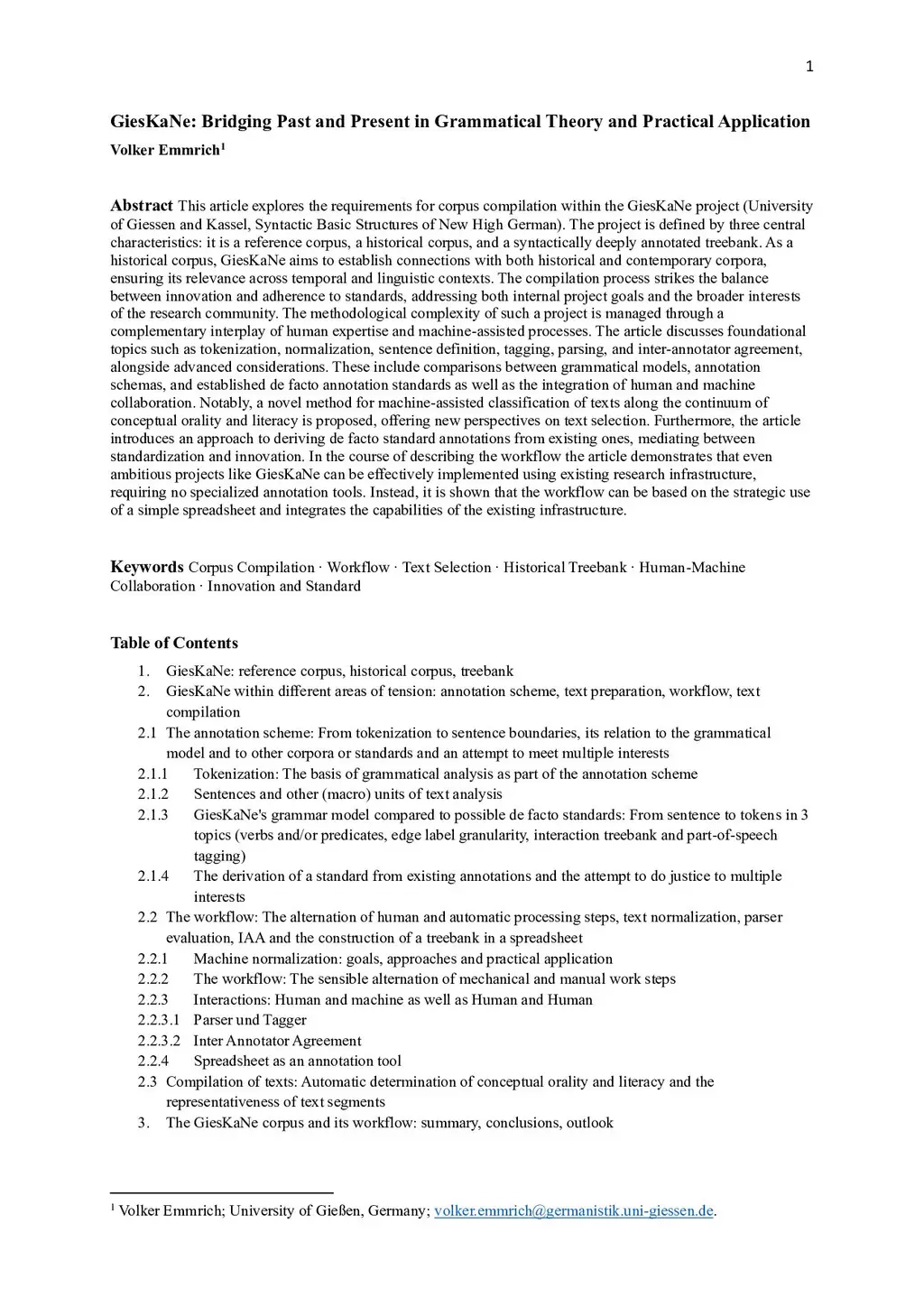 This article explores the requirements for corpus compilation within the GiesKaNe project (University of Giessen and Kassel, Syntactic Basic Structures of New High German). The project is defined by three central characteristics: it is a reference corpus, a historical corpus, and a syntactically deeply annotated treebank. As a historical corpus, GiesKaNe aims to establish connections with both historical and contemporary corpora, ensuring its relevance across temporal and linguistic contexts. The compilation process strikes the balance between innovation and adherence to standards, addressing both internal project goals and the broader interests of the research community. The methodological complexity of such a project is managed through a complementary interplay of human expertise and machine-assisted processes. The article discusses foundational topics such as tokenization, normalization, sentence definition, tagging, parsing, and inter-annotator agreement, alongside advanced considerations. These include comparisons between grammatical models, annotation schemas, and established de facto annotation standards as well as the integration of human and machine collaboration. Notably, a novel method for machine-assisted classification of texts along the continuum of conceptual orality and literacy is proposed, offering new perspectives on text selection. Furthermore, the article introduces an approach to deriving de facto standard annotations from existing ones, mediating between standardization and innovation. In the course of describing the workflow the article demonstrates that even ambitious projects like GiesKaNe can be effectively implemented using existing research infrastructure, requiring no specialized annotation tools. Instead, it is shown that the workflow can be based on the strategic use of a simple spreadsheet and integrates the capabilities of the existing infrastructure.