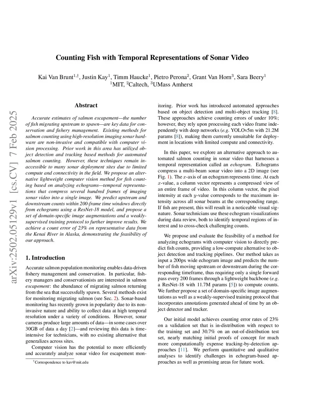 Accurate estimates of salmon escapement - the number of fish migrating upstream to spawn - are key data for conservation and fishery management. Existing methods for salmon counting using high-resolution imaging sonar hardware are non-invasive and compatible with computer vision processing. Prior work in this area has utilized object detection and tracking based methods for automated salmon counting. However, these techniques remain inaccessible to many sonar deployment sites due to limited compute and connectivity in the field. We propose an alternative lightweight computer vision method for fish counting based on analyzing echograms - temporal representations that compress several hundred frames of imaging sonar video into a single image. We predict upstream and downstream counts within 200-frame time windows directly from echograms using a ResNet-18 model, and propose a set of domain-specific image augmentations and a weakly-supervised training protocol to further improve results. We achieve a count error of 23% on representative data from the Kenai River in Alaska, demonstrating the feasibility of our approach.