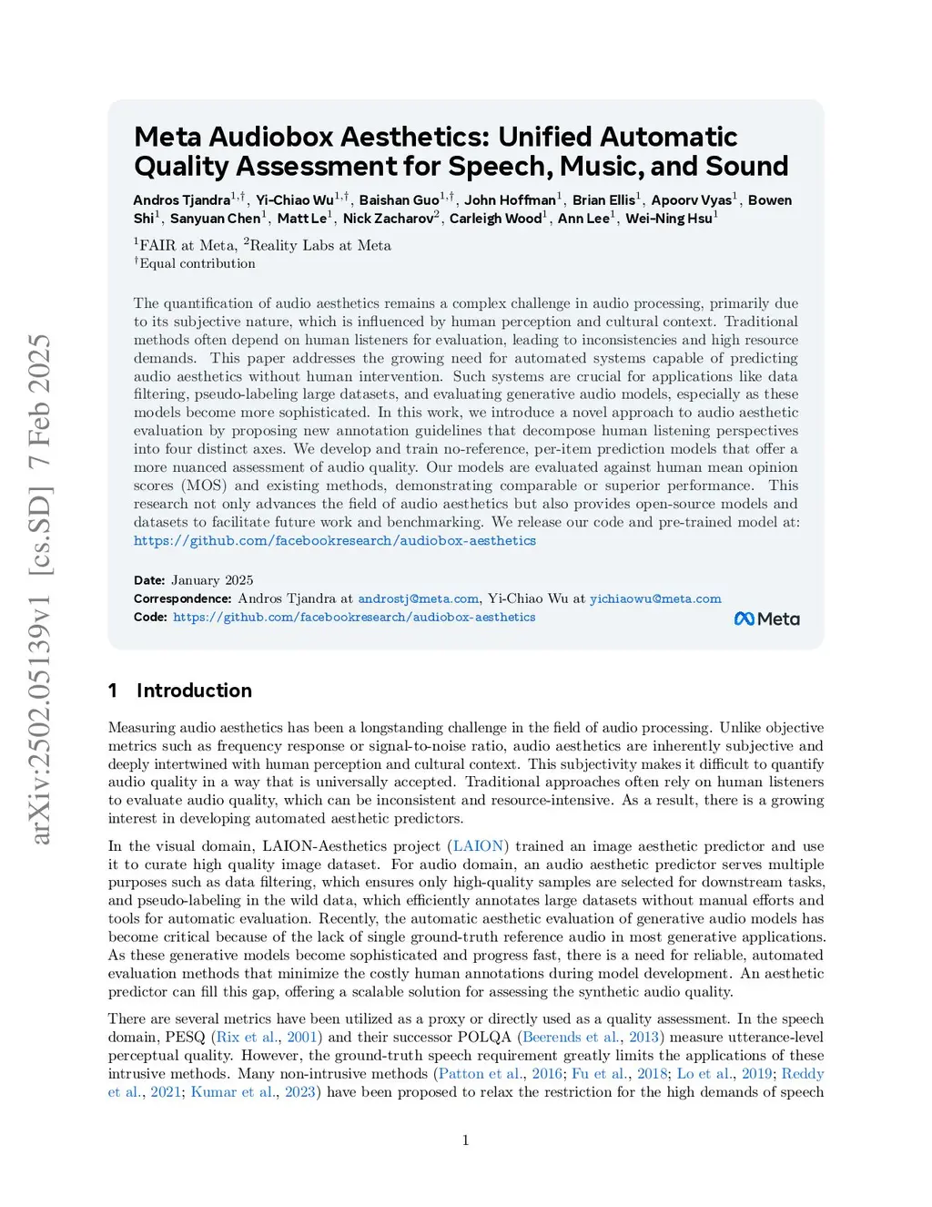 Meta Audiobox Aesthetics: Unified Automatic Quality Assessment for Speech, Music, and Sound