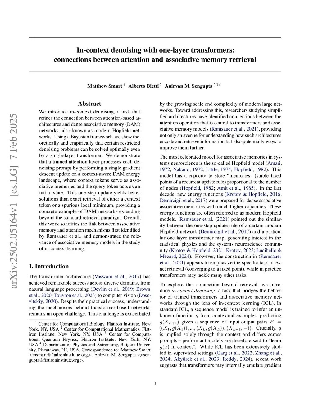 We introduce in-context denoising, a task that refines the connection between attention-based architectures and dense associative memory (DAM) networks, also known as modern Hopfield networks. Using a Bayesian framework, we show theoretically and empirically that certain restricted denoising problems can be solved optimally even by a single-layer transformer. We demonstrate that a trained attention layer processes each denoising prompt by performing a single gradient descent update on a context-aware DAM energy landscape, where context tokens serve as associative memories and the query token acts as an initial state. This one-step update yields better solutions than exact retrieval of either a context token or a spurious local minimum, providing a concrete example of DAM networks extending beyond the standard retrieval paradigm. Overall, this work solidifies the link between associative memory and attention mechanisms first identified by Ramsauer et al., and demonstrates the relevance of associative memory models in the study of in-context learning.
