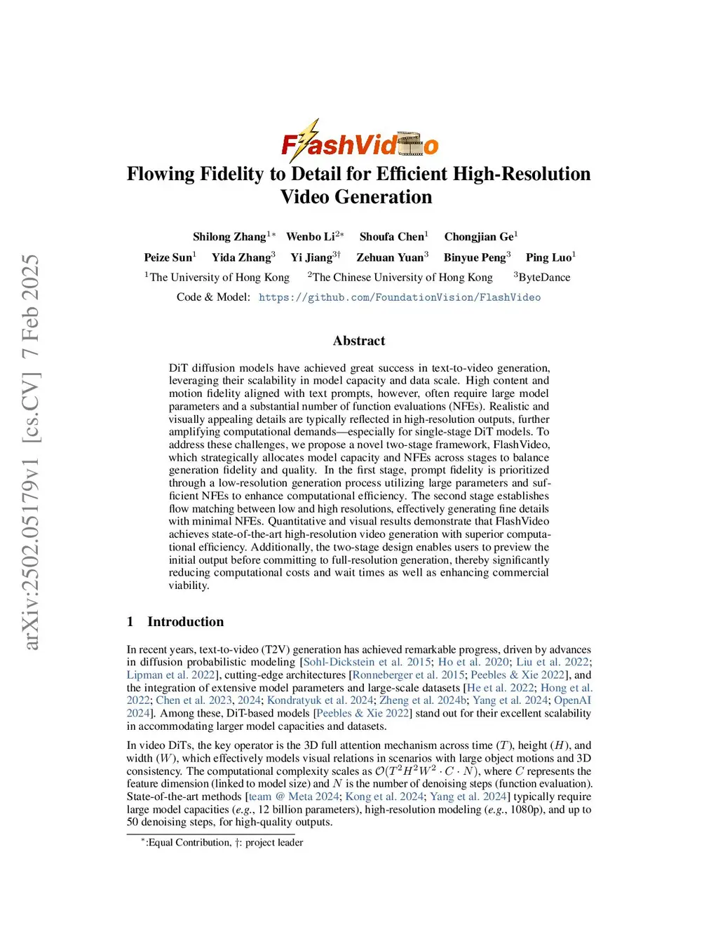 DiT models have achieved great success in text-to-video generation, leveraging their scalability in model capacity and data scale. High content and motion fidelity aligned with text prompts, however, often require large model parameters and a substantial number of function evaluations (NFEs). Realistic and visually appealing details are typically reflected in high-resolution outputs, further amplifying computational demands-especially for single-stage DiT models. To address these challenges, we propose a novel two-stage framework, FlashVideo, which strategically allocates model capacity and NFEs across stages to balance generation fidelity and quality. In the first stage, prompt fidelity is prioritized through a low-resolution generation process utilizing large parameters and sufficient NFEs to enhance computational efficiency. The second stage achieves a nearly straight ODE trajectory between low and high resolutions via flow matching, effectively generating fine details and fixing artifacts with minimal NFEs. To ensure a seamless connection between the two independently trained stages during inference, we carefully design degradation strategies during the second-stage training. Quantitative and visual results demonstrate that FlashVideo achieves state-of-the-art high-resolution video generation with superior computational efficiency. Additionally, the two-stage design enables users to preview the initial output and accordingly adjust the prompt before committing to full-resolution generation, thereby significantly reducing computational costs and wait times as well as enhancing commercial viability.