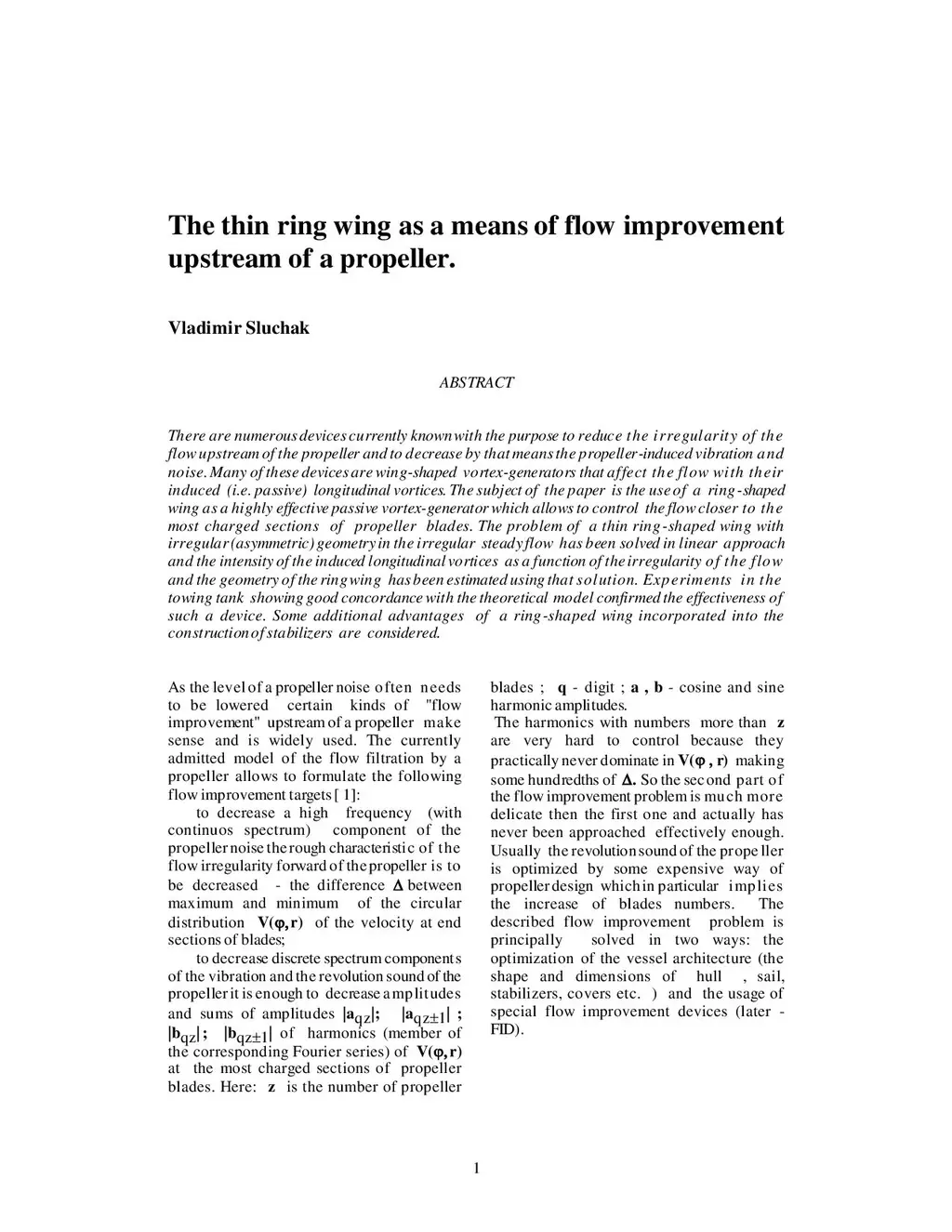There are numerous devices currently known with the purpose of reducing the irregularity of the flow upstream of the propeller and to decrease by that means the propeller-induced vibration and noise. Many of these devices are wing-shaped vortex-generators that affect the flow with their induced (i.e. passive) longitudinal vortices. The paper's subject is the use of a ring-shaped wing as a highly effective passive vortex-generator which allows to control the flow closer to the most charged sections of propeller blades. The problem of a thin ring-shaped wing with irregular (asymmetric) geometry in the irregular steady flow has been solved in a linear approach and the intensity of the induced longitudinal vortices as a function of the irregularity of the flow and the geometry of the ring wing has been estimated using that solution. Experiments in the towing tank showing good concordance with the theoretical model confirmed the effectiveness of such a device. Some additional advantages of a ring-shaped wing incorporated into the construction of stabilizers are considered.
