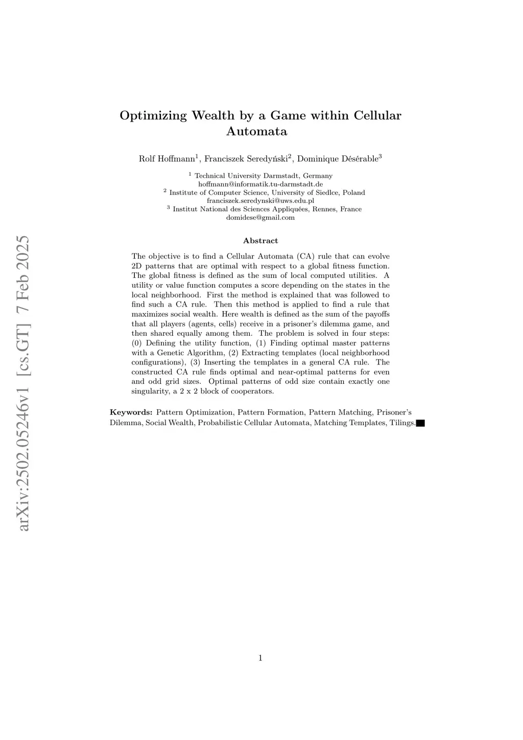 The objective is to find a Cellular Automata (CA) rule that can evolve 2D patterns that are optimal with respect to a global fitness function. The global fitness is defined as the sum of local computed utilities. A utility or value function computes a score depending on the states in the local neighborhood. First the method is explained that was followed to find such a CA rule. Then this method is applied to find a rule that maximizes social wealth. Here wealth is defined as the sum of the payoffs that all players (agents, cells) receive in a prisoner's dilemma game, and then shared equally among them. The problem is solved in four steps: (0) Defining the utility function, (1) Finding optimal master patterns with a Genetic Algorithm, (2) Extracting templates (local neighborhood configurations), (3) Inserting the templates in a general CA rule. The constructed CA rule finds optimal and near-optimal patterns for even and odd grid sizes. Optimal patterns of odd size contain exactly one singularity, a 2 x 2 block of cooperators.