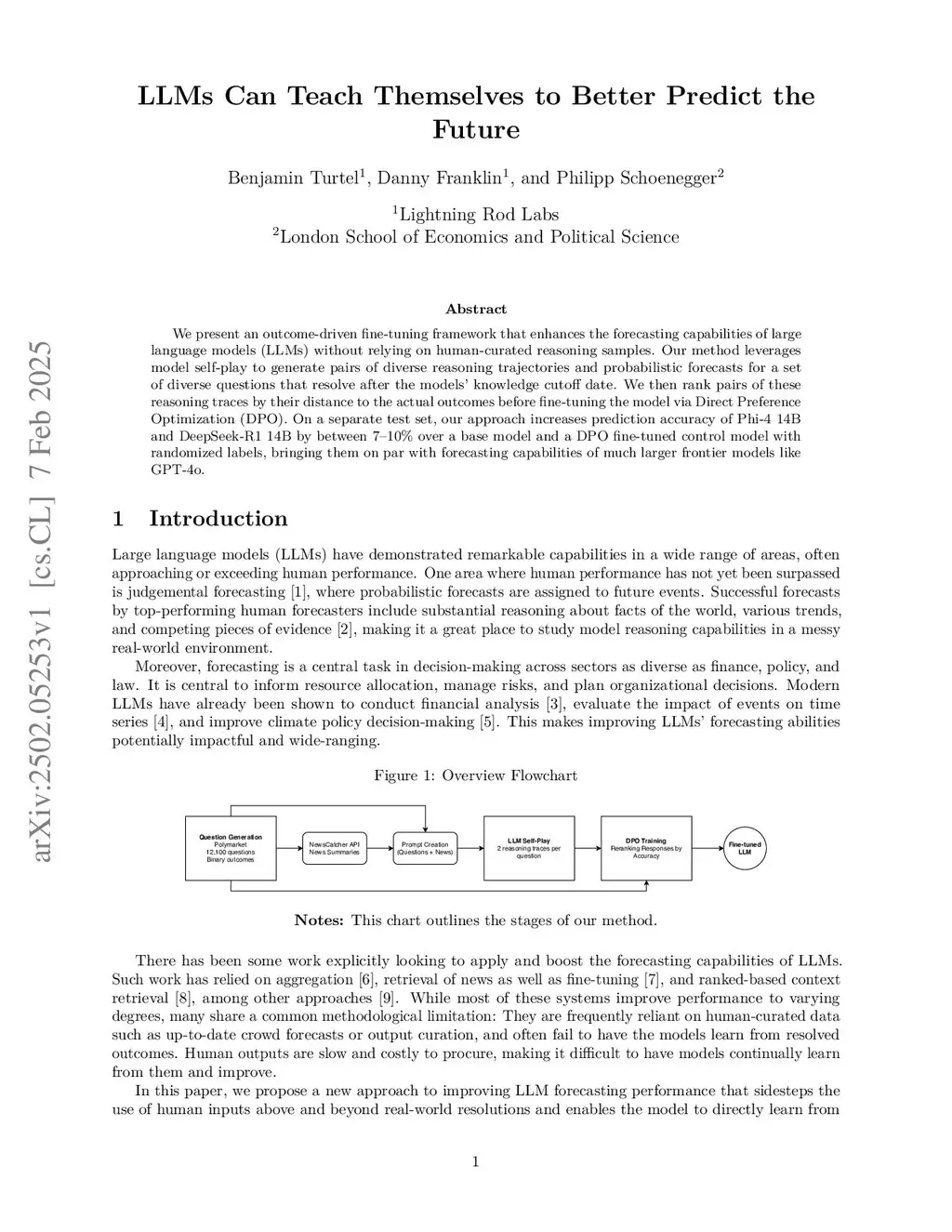 We present an outcome-driven fine-tuning framework that enhances the forecasting capabilities of large language models (LLMs) without relying on human-curated reasoning samples. Our method leverages model self-play to generate pairs of diverse reasoning trajectories and probabilistic forecasts for a set of diverse questions that resolve after the models' knowledge cutoff date. We then rank pairs of these reasoning traces by their distance to the actual outcomes before fine-tuning the model via Direct Preference Optimization (DPO). On a separate test set, our approach increases prediction accuracy of Phi-4 14B and DeepSeek-R1 14B by between 7--10\% over a base model and a DPO fine-tuned control model with randomized labels, bringing them on par with forecasting capabilities of much larger frontier models like GPT-4o.