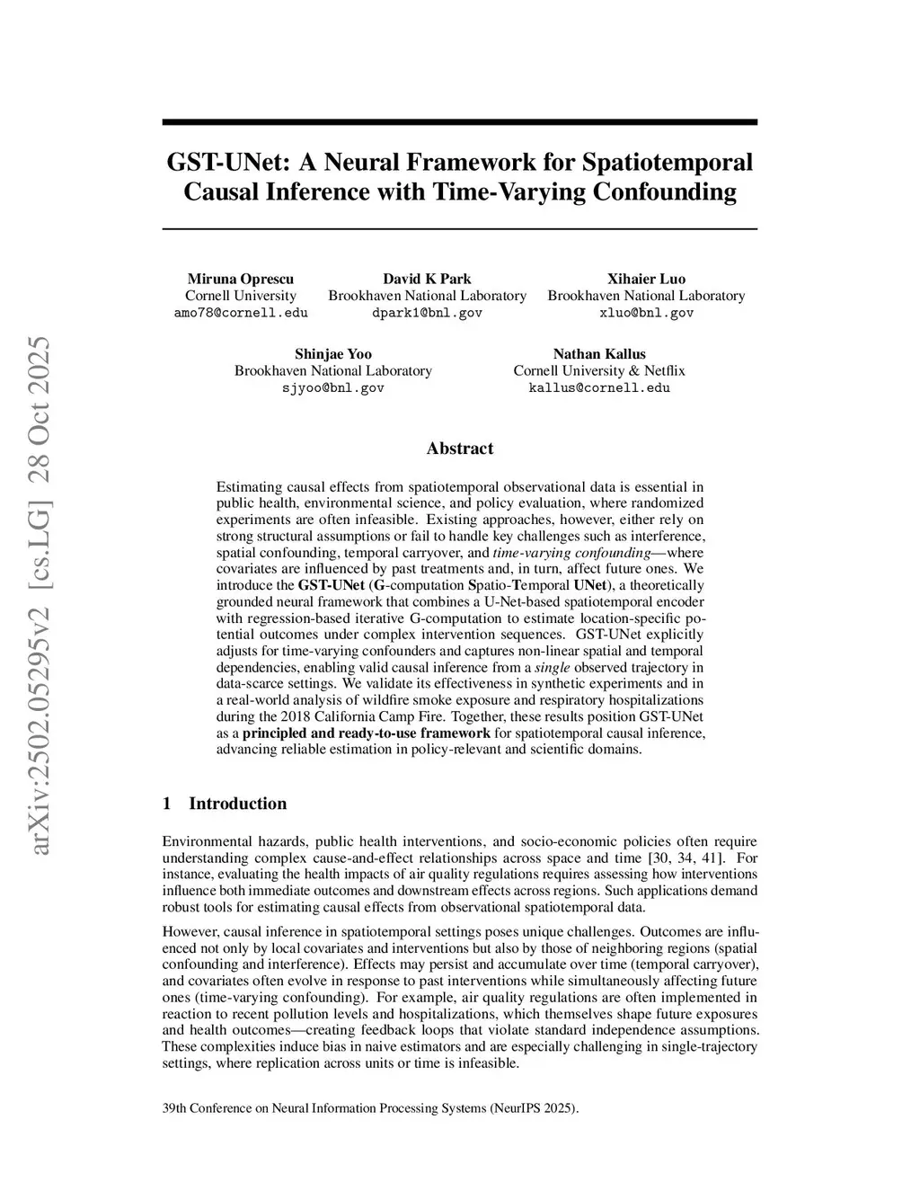 Estimating causal effects from spatiotemporal observational data is essential in public health, environmental science, and policy evaluation, where randomized experiments are often infeasible. Existing approaches, however, either rely on strong structural assumptions or fail to handle key challenges such as interference, spatial confounding, temporal carryover, and time-varying confounding -- where covariates are influenced by past treatments and, in turn, affect future ones. We introduce GST-UNet (G-computation Spatio-Temporal UNet), a theoretically grounded neural framework that combines a U-Net-based spatiotemporal encoder with regression-based iterative G-computation to estimate location-specific potential outcomes under complex intervention sequences. GST-UNet explicitly adjusts for time-varying confounders and captures non-linear spatial and temporal dependencies, enabling valid causal inference from a single observed trajectory in data-scarce settings. We validate its effectiveness in synthetic experiments and in a real-world analysis of wildfire smoke exposure and respiratory hospitalizations during the 2018 California Camp Fire. Together, these results position GST-UNet as a principled and ready-to-use framework for spatiotemporal causal inference, advancing reliable estimation in policy-relevant and scientific domains.